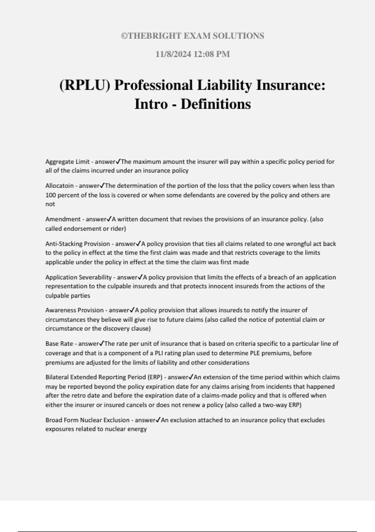 Definitions - answer✔A section of an insurance policy that defines terms used throughout the policy