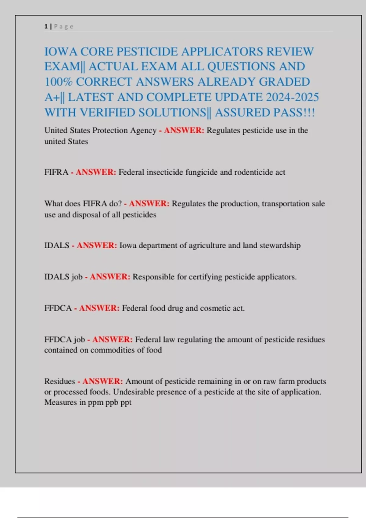 FIFRA - ANSWER: Federal insecticide fungicide and rodenticide act