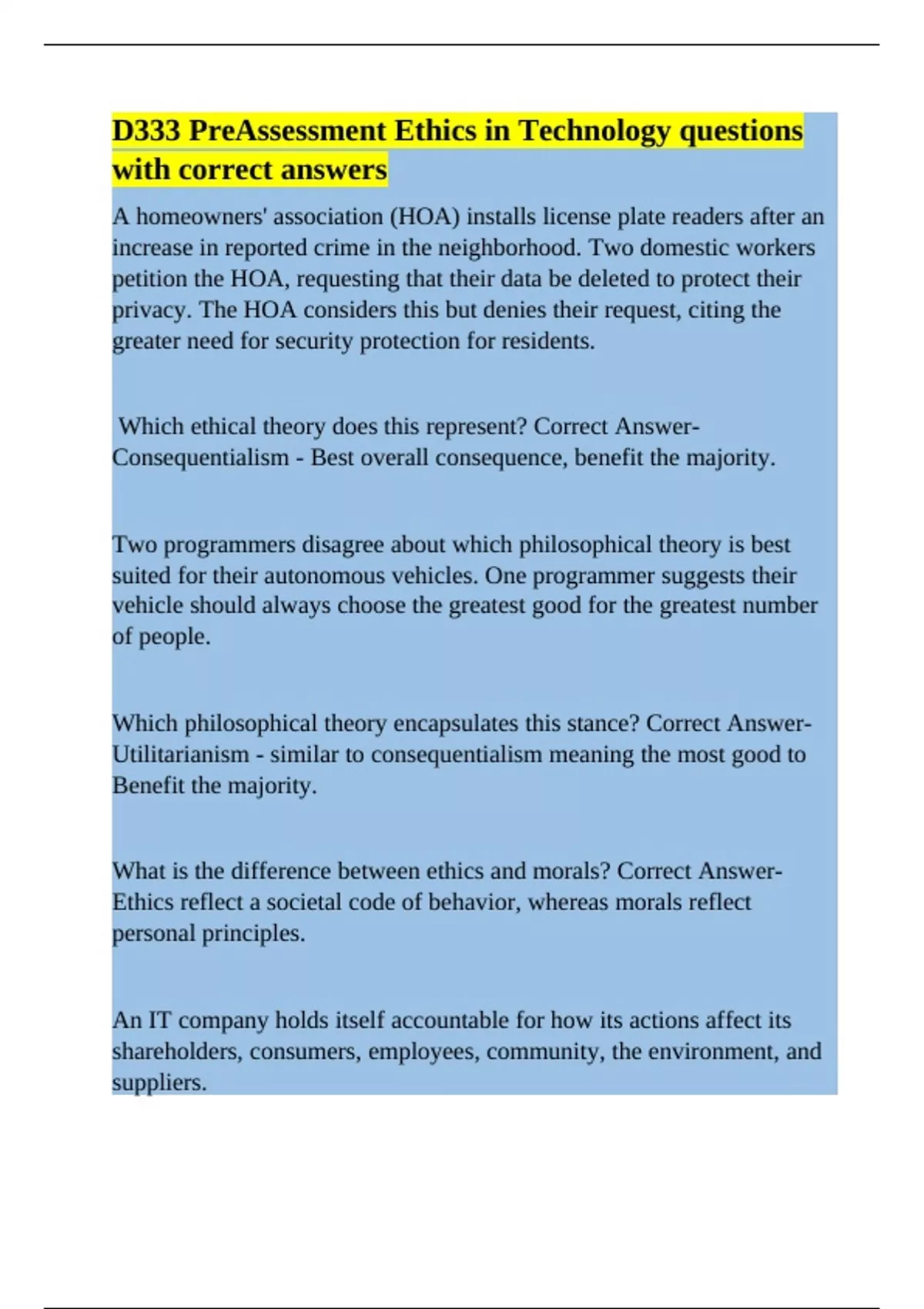 D333 PreAssessment Ethics in Technology questions with correct answers.