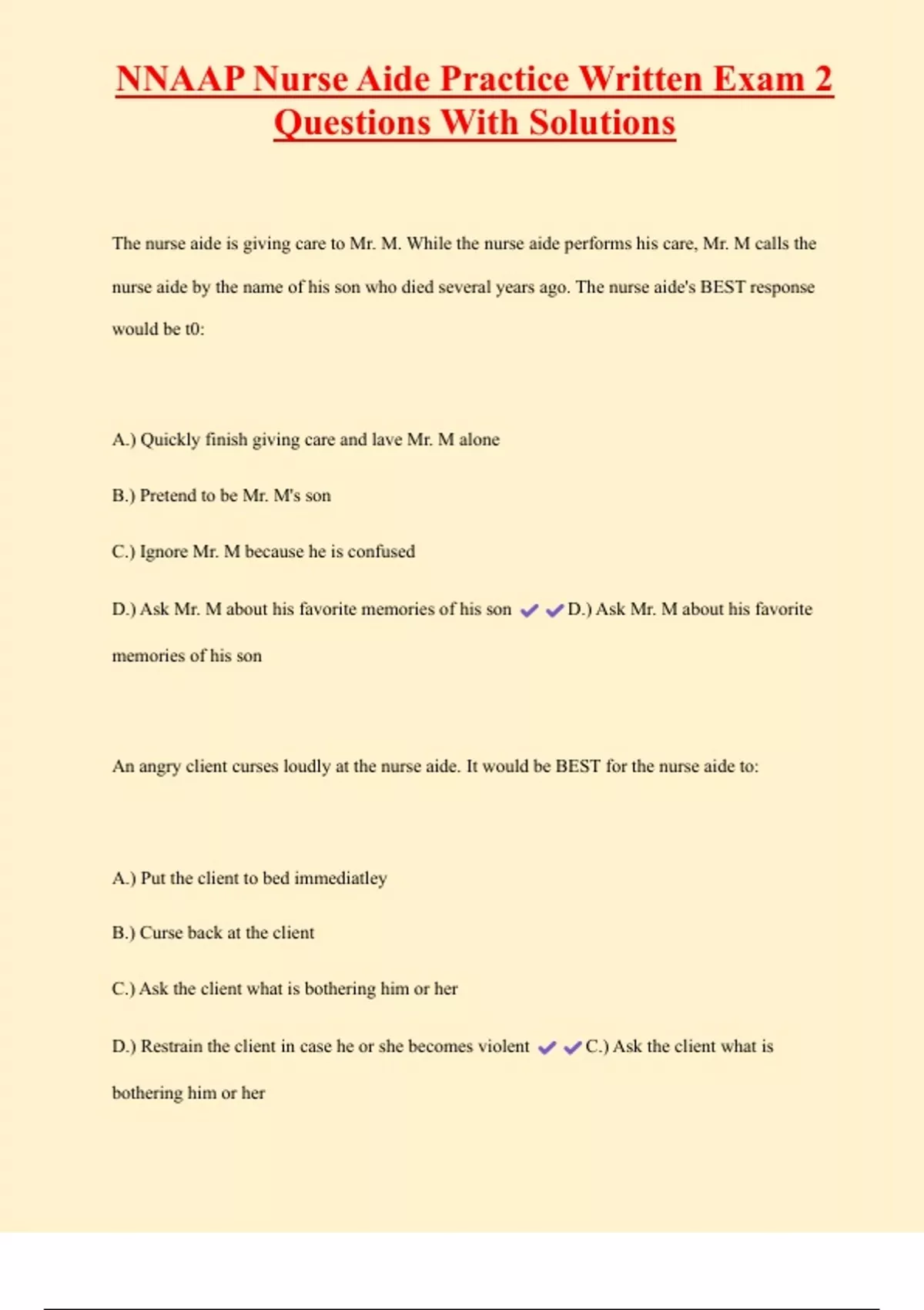 NNAAP Nurse Aide Practice Written Exam 2 Questions With Solutions The nurse aide is giving care to Mr. M. While the nurse aide performs his care, Mr. M calls the nurse aide by the name of his son who died several years ago. The nurse aide's BEST response would be t0: A.) Quickly finish giving care and lave Mr. M alone B.) Pretend to be Mr. M's son C.) Ignore Mr. M because he is confused D.) Ask Mr. M about his favorite memories of his son D.) Ask Mr. M about his favorite memories of his son