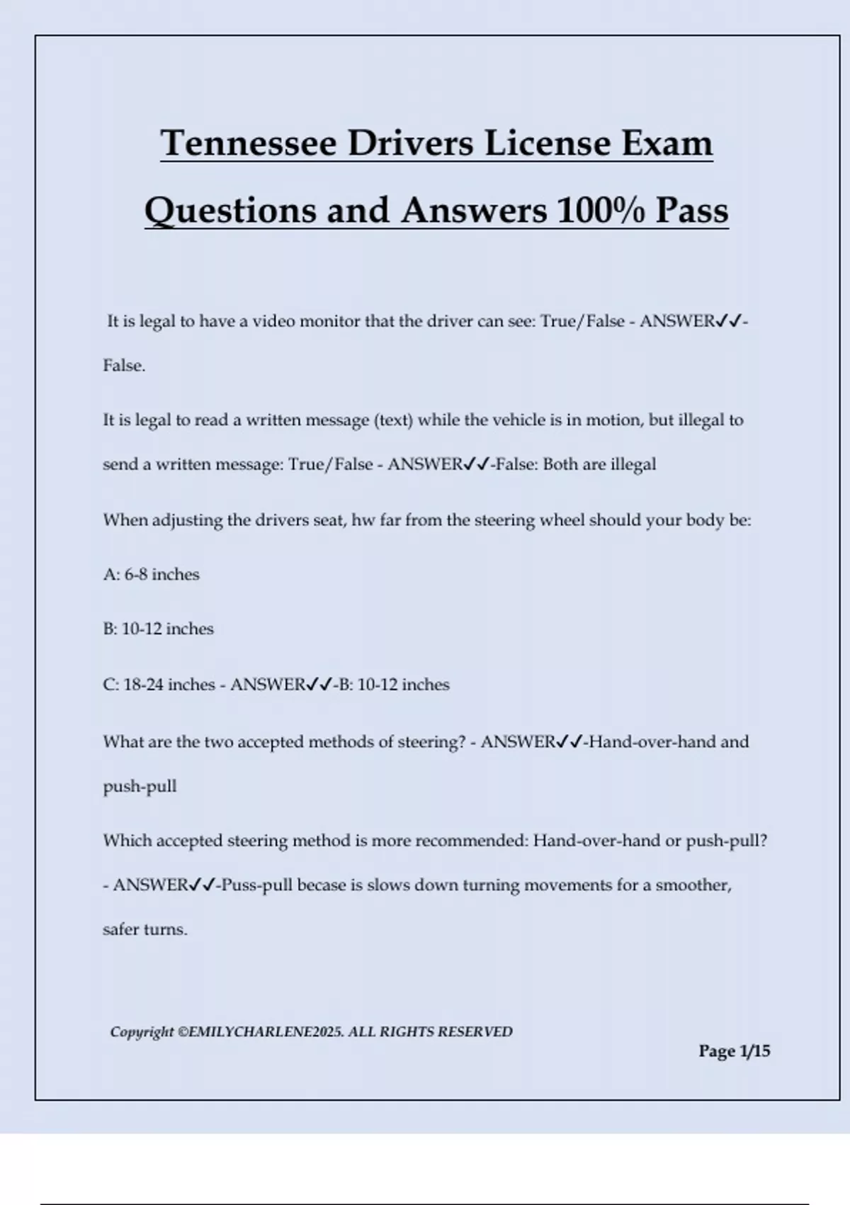 Tennessee Drivers License Exam Questions and Answers 100% Pass It is legal to have a video monitor that the driver can see: True/False - ANSWER- False. It is legal to read a written message (text) while the vehicle is in motion, but illegal to send a written message: True/False - ANSWER-False: Both are illegal When adjusting the drivers seat, hw far from the steering wheel should your body be: A: 6-8 inches B: 10-12 inches C: 18-24 inches - ANSWER-B: 10-12 inches What are the two accepted methods of steering? - ANSWER-Hand-over-hand and push-pull Which accepted steering method is more recommended: Hand-over-hand or push-pull? - ANSWER-Puss-pull becase is slows down turning movements for a smoother, safer turns. Copyright ©EMILYCHARLENE2025. ALL RIGHTS RESERVED Page 2/15 When backing up, what do you do before putting the car in Reverse? - ANSWER- Put your foot on the brake When preparing to move forward, what do you do before putting the car in Drive? - ANSWER-Put your foot on the brake Where do you stop at a traffic signal or stop sign? - ANSWER-Before a crosswalk or a marked stop line What if there is no marked like? - ANSWER-At the point of the nearest intersecting roadway, where you can see approaching traffic before entering the intersection Name 3 things to avoid carbon monoxide poisoning - ANSWER-1. Never let engine run in a closed garage 2. Do not use heater/AC in a parked car with windows closed 3. Close the fresh-air vent in congested traffic How far from the curb should you park? A: 6 inches B: 12 inches C: 18 inches - ANSWER-Within 18 inches When do you adjust your mirrors? - ANSWER-Once your seat is adjusted Copyright ©EMILYCHARLENE2025. ALL RIGHTS RESERVED Page 3/15 When adjusting the inside rear view mirror, what should you see? - ANSWER-It should frame the rear window and to avoid blind spots, only the edge of the right rear window post should be seen. When adjusting the left side mirror, what should you see? - ANSWER-The rear fender should be just visible on the left edge of the mirror, about a half inch from the bottom Where should the lap belt (seat belt) be positioned on your body? - ANSWER-across your hips, touching top of your legs What age/weight requires a rear facing car seat? - ANSWER-Under one year, or weighing less than 20 pounds What age/weight requires a forward facing car seat? - ANSWER-One to three years old, weighing more than 20 pounds What age/height requires a booster seat? - ANSWER-Four to eight years old, whose hight is under 4'9" Up to what age is the driver responsible to make sure passengers are properly restrained? - ANSWER-Drivinger is response for passengers up to the age of 16 Who in the front seat is required to wear a seat belt? Driver or passenger? - ANSWER-Safety belts are required for ALL drive