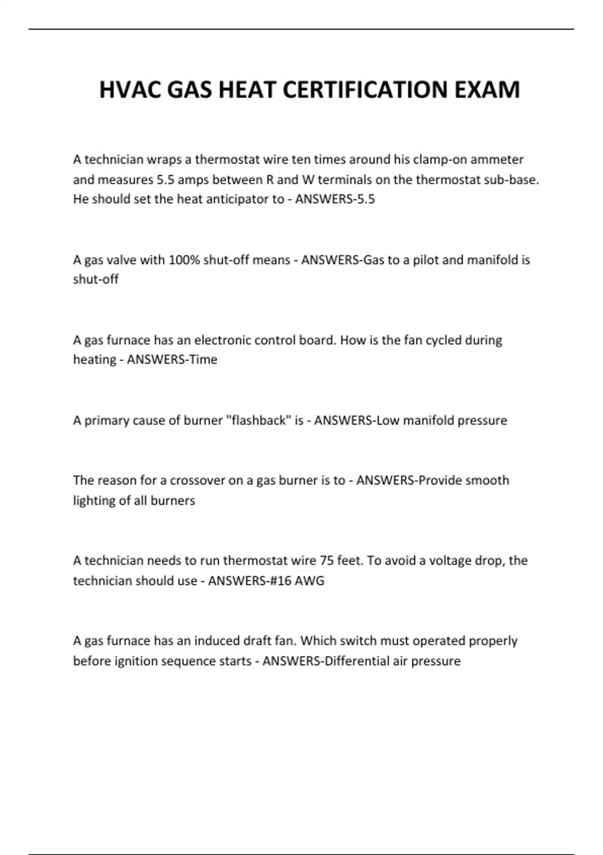 HVAC GAS HEAT CERTIFICATION EXAM QUESTIONS AND ANSWERS 2024