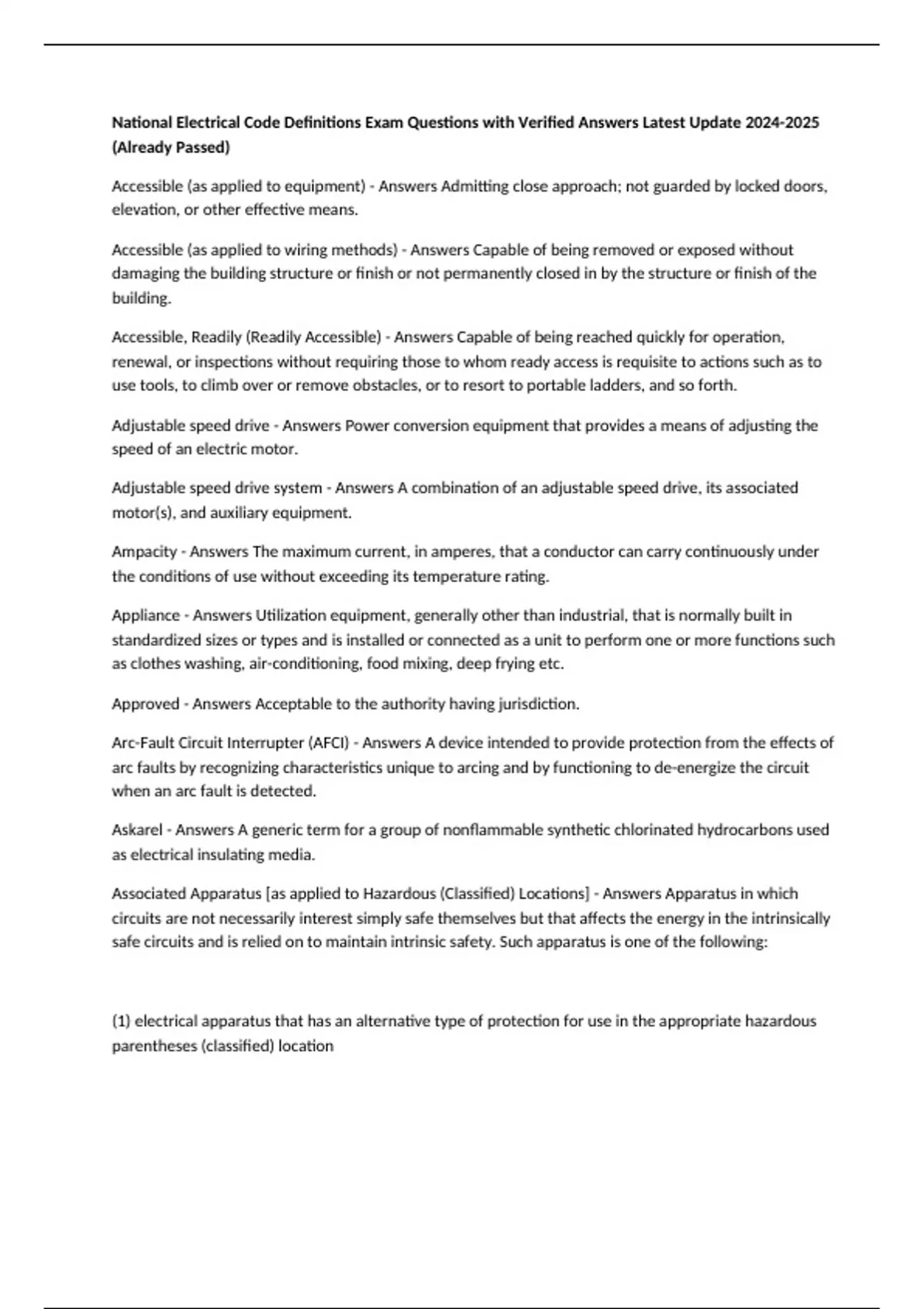 National Electrical Code Definitions Exam Questions with Verified Answers Latest Update (Already Passed) Accessible (as applied to equipment) - Answers Admitting close approach; not guarded by locked doors, elevation, or other effective means. Accessible (as applied to wiring methods) - Answers Capable of being removed or exposed without damaging the building structure or finish or not permanently closed in by the structure or finish of the building. Accessible, Readily (Readily Accessible) - Answers Capable of being reached quickly for operation, renewal, or inspections without requiring those to whom ready access is requisite to actions such as to use tools, to climb over or remove obstacles, or to resort to portable ladders, and so forth. Adjustable speed drive - Answers Power conversion equipment that provides a means of adjusting the speed of an electric motor. Adjustable speed drive system - Answers A combination of an adjustable speed drive, its associated motor(s), and auxiliary equipment. Ampacity - Answers The maximum current, in amperes, that a conductor can carry continuously under the conditions of use without exceeding its temperature rating. Appliance - Answers Utilization equipment, generally other than industrial, that is normally built in standardized sizes or types and is installed or connected as a unit to perform one or more functions such as clothes washing, air-conditioning, food mixing, deep frying etc. Approved - Answers Acceptable to the authority having jurisdiction. Arc-Fault Circuit Interrupter (AFCI) - Answers A device intended to provide protection from the effects of arc faults by recognizing characteristics unique to arcing and by functioning to de-energize the circuit when an arc fault is detected. Askarel - Answers A generic term for a group of nonflammable synthetic chlorinated hydrocarbons used as electrical insulating media. Associated Apparatus [as applied to Hazardous (Classified) Locations] - Answers Apparatus in which circuits are not necessarily interest simply safe themselves but that affects the energy in the intrinsically safe circuits and is relied on to maintain intrinsic safety. Such apparatus is one of the following: (1) electrical apparatus that has an alternative type of protection for use in the appropriate hazardous parentheses (classified) location (2) electrical apparatus not so protected that shall not be used within a hazardous (classified) location Associated nonicendive feild apparatus [as applied to hazardous (Classified) locations] - Answers Apparatus in which the circuits are not necessarily nonincendive send of themselves but that affect the energy in nonincendive field wiring circuits in our relied upon to maintain non-incentive energy levels. Such apparatuses are one of the following: (1) electrical apparatus that has an alternative type of protection for use in the appropriate hazardous (classified) location (2) electrical apparatus not so protected that shall not be used in a hazardous (classified) location Attachment Plug (Plug Cap) (Plug) - Answers A device that, by insertion in a receptacle, establishes a connection between the conductors of the attached flexible cord and the conductors connected permanently to the receptacle. Authority Having Jurisdiction (AHJ) - Answers An organization, office, or individual responsible for enforcing the requirements of a code or standard, or for approving equipment, materials, an installation, or a procedure. Automatic - Answers Performing a function without the necessity of human intervention. Bathroom - Answers An area including a basin with one or more of the following: a toilet, a urinal, a tub, a shower, a bidet, or similar plumbing fixtures. Battery System - Answers Interconnected battery subsystems consisting of one or more storage batteries and battery chargers, and can include inverters, converters, and associated electrical equipment. Bonded (Bonding) - Answers Connected to establish electrical continuity and conductivity. Bonding Conductor or Jumper - Answers A reliable conductor to ensure the required electrical conductivity between metal parts required to be electrically connected. Bonding Jumper, Equipment - Answers The connection between two or more portions of the equipment grounding conductor. Bonding Jumper, Main - Answers The connection between the grounded circuit conductor and the equipment grounding conductor at the service.