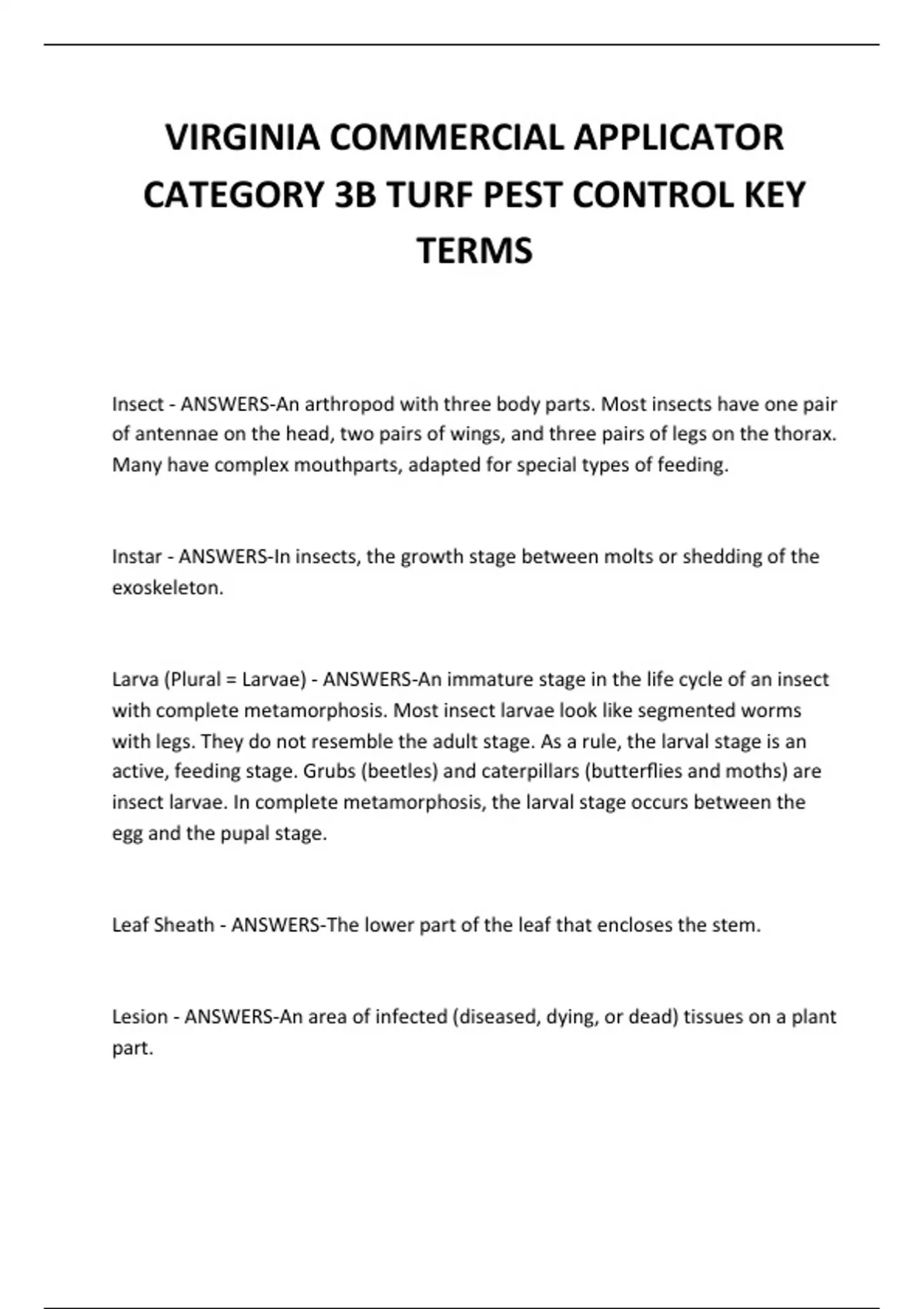 VIRGINIA COMMERCIAL APPLICATOR CATEGORY 3B TURF PEST CONTROL KEY TERMS QUESTIONS AND ANSWERS 2024