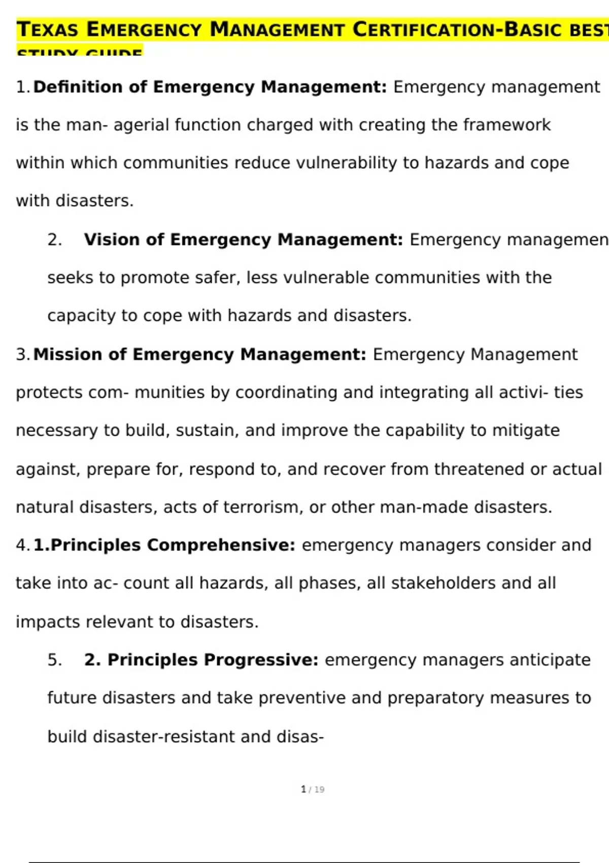 TEXAS EMERGENCY MANAGEMENT CERTIFICATION-BASIC BEST STUDY GUIDE 1. Definition of Emergency Management: Emergency management is the man- agerial function charged with creating the framework within which communities reduce vulnerability to hazards and cope with disasters. 2. Vision of Emergency Management: Emergency management seeks to promote safer, less vulnerable communities with the capacity to cope with hazards and disasters. 3. Mission of Emergency Management: Emergency Management protects com- munities by coordinating and integrating all activi- ties necessary to build, sustain, and improve the capability to mitigate against, prepare for, respond to, and recover from threatened or actual natural disasters, acts of terrorism, or other man-made disasters.