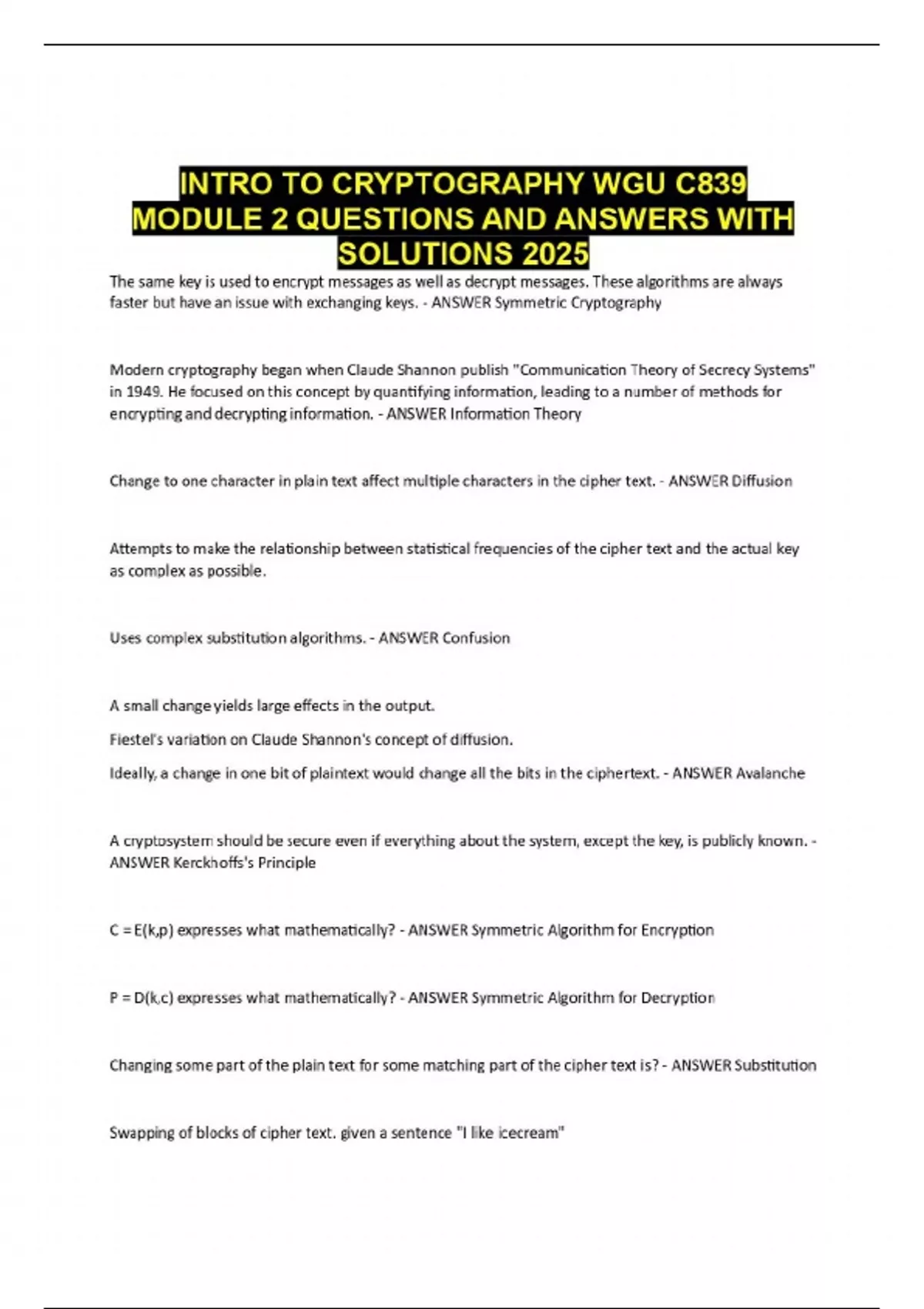 INTRO TO CRYPTOGRAPHY WGU C839 MODULE 2 QUESTIONS AND ANSWERS WITH SOLUTIONS 2025