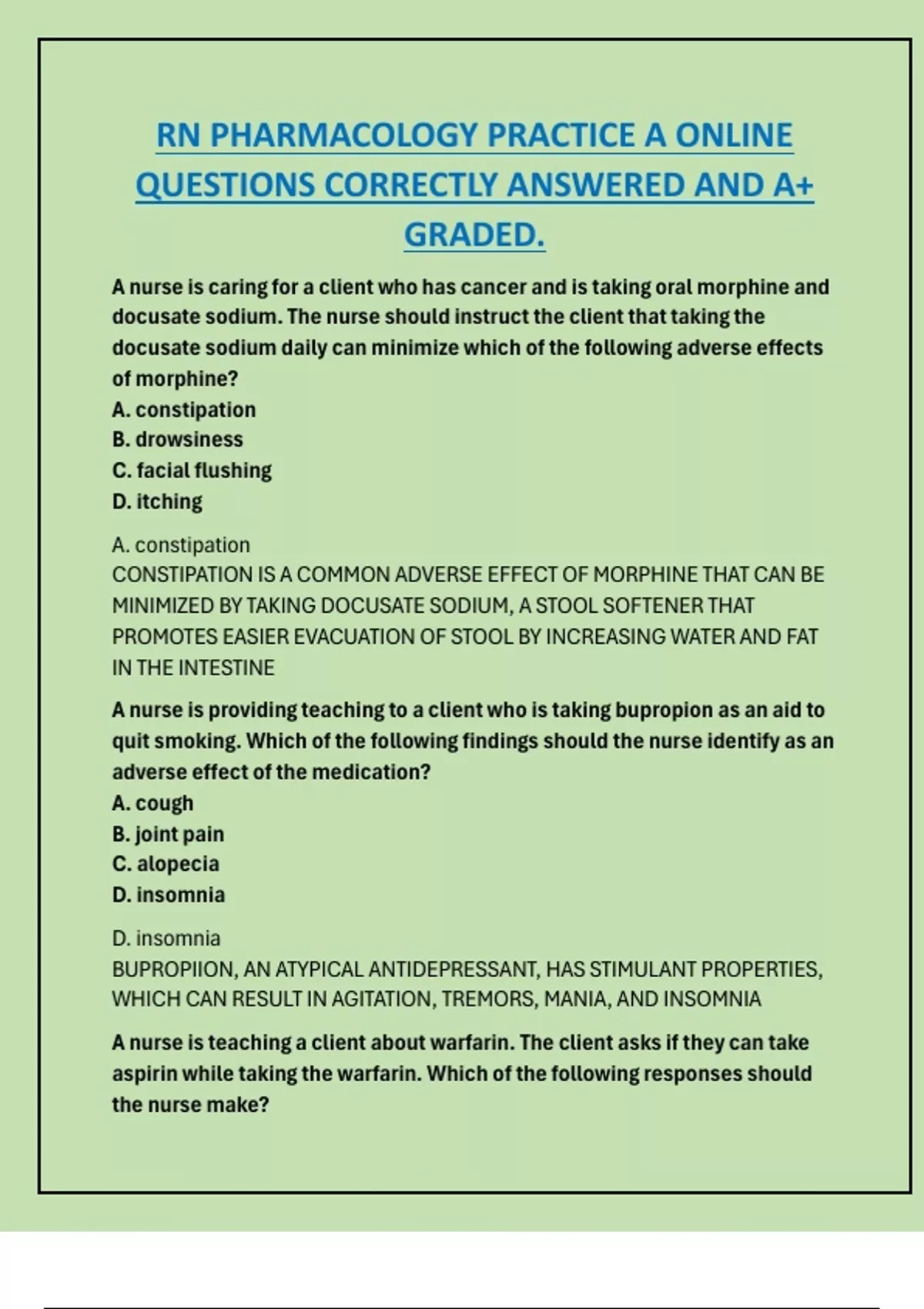 RN PHARMACOLOGY PRACTICE A ONLINE QUESTIONS CORRECTLY ANSWERED AND A+ GRADED