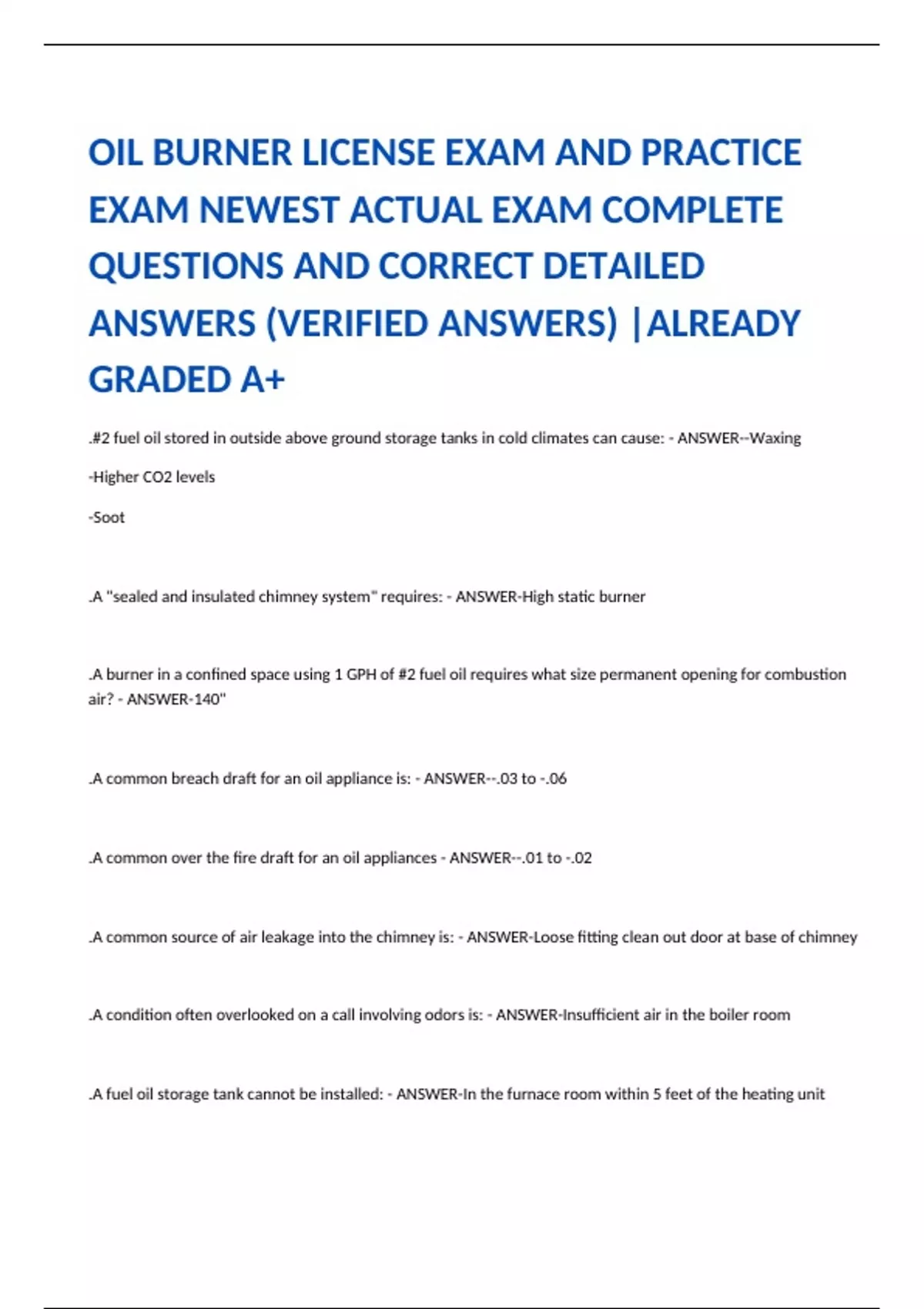 OIL BURNER LICENSE EXAM AND PRACTICE EXAM NEWEST ACTUAL EXAM COMPLETE QUESTIONS AND CORRECT DETAILED ANSWERS (VERIFIED ANSWERS) |ALREADY GRADED A+ .#2 fuel oil stored in outside above ground storage tanks in cold climates can cause: - ANSWER--Waxing -Higher CO2 levels -Soot .A "sealed and insulated chimney system" requires: - ANSWER-High static burner .A burner in a confined space using 1 GPH of #2 fuel oil requires what size permanent opening for combustion air? - ANSWER-140" .A common breach draft for an oil appliance is: - ANSWER--.03 to -.06 .A common over the fire draft for an oil appliances - ANSWER--.01 to -.02 .A common source of air leakage into the chimney is: - ANSWER-Loose fitting clean out door at base of chimney .A condition often overlooked on a call involving odors is: - ANSWER-Insufficient air in the boiler room .A fuel oil storage tank cannot be installed: - ANSWER-In the furnace room within 5 feet of the heating unit .A high CO2 reading is caused by.. - ANSWER-Incomplete combustion .A layer of soot 1/16" thick will increase fuel consumption by: - ANSWER-4% .A material with electrons so loose it allows voltage to pass with little or no resistance.. - ANSWER-Is a conductor .A method of dealing with low viscosity/cold temps with #2 oil? - ANSWER-Increase pump pressure/ decrease nozzle size .A one-pipe system: - ANSWER-Must NOT have the bypass plug inserted in the pump. .A properly set up and adjusted oil fire appliance should produce a CO2 measurement of: - ANSWER-10% to 12% .A pump in a one pipe system that is full of air can be self purged. - ANSWER-False .A reverse acting aquastat is used in a hydronic system to: - ANSWER-Stop the circulator when the water temperature falls below a preset temperature .A significant difference between the CO2 or O2 reading at the flue pipe and over the fire is indication of: - ANSWER-Air leakage in the boiler .A simple, effective, yet inexpensive way to increase on-cycle system efficiency is to: - ANSWER-Match the nozzle to the heating load .A single stationary conductor in the flux of a permanent magnet will: - ANSWER--NOT induce a current flow in the conductor -NOT reverse the current flow in the conductor -NOT increase the amperage in the conductor .A stack switch is no longer allowed to be installed or replaced because.. - ANSWER-It's safety cutout time is higher than what is now required. .A stack thermometer commonly has a range from: - ANSWER-200° to 1000° .A steam pigtail should always be installed between the pressuretrol and the boiler to: - ANSWER-Place a water seal between the boiler and the pressuretrol .A technician is servicing an oil fired appliance that uses a cad cell primary control. The control locks out after a brief period of time. Which of the following can cause this to happen? - ANSWER-The cad cell does not sense light. .A typical ignition transformer is of what type? - ANSWER-Step-up .A typical residential zone valve for a hot water heating system normally operates on: - ANSWER-24 volts .A zero smoke and low CO2 or high O2 reading could be caused by: - ANSWER-Too much excess air .According to NFPA 31-2001, what is the minimum size of the fill pipe on an oil storage tank? - ANSWER-1 1/4" .Air is composed of oxygen and nitrogen in what percentages? - ANSWER-21 and 79 .An acceptable smoke test reading for new modern equipment is: - ANSWER-Between #0 and #1 .An advantage of power venting is: - ANSWER--Installing an oil fired unit where there is no chimney -More positive control of draft -Lower cost of new homes .An electrical switch that proves proper draft has been established is called what? - ANSWER-Air proving switch .An often overlooked cause of a high CO2 reading is.. - ANSWER-Not enough combustion air in the equipment room. .Atomizing type burners were designed to burn which type of fuel? - ANSWER-#2 oil .Because burner fans have beveled blades any dirt or lint in the blade will: - ANSWER-Reduce the amount of air for combustion .Because of the cad cell eye's limited sensing range, it can only be used effectively to: - ANSWER-Monitor an oil flame .Before installing a new nozzle the service technician should: - ANSWER-Flush out the nozzle line and adapter .Before lowering the temperature of a hot water boiler, consideration must be given to the: - ANSWER-Design of the heating system .Breaking up oil into small droplets is called: - ANSWER-Atomization .Burner air fans are manufactured to very close tolerances because an unbalanced fan can: - ANSWER--Put a strain on motor bearings -Create vibrations .Burner ignition systems normally operate at what primary voltage? - ANSWER-120 V .Burner ignition transformers operate at what secondary voltage range? - ANSWER-10,000 to 14,000 V