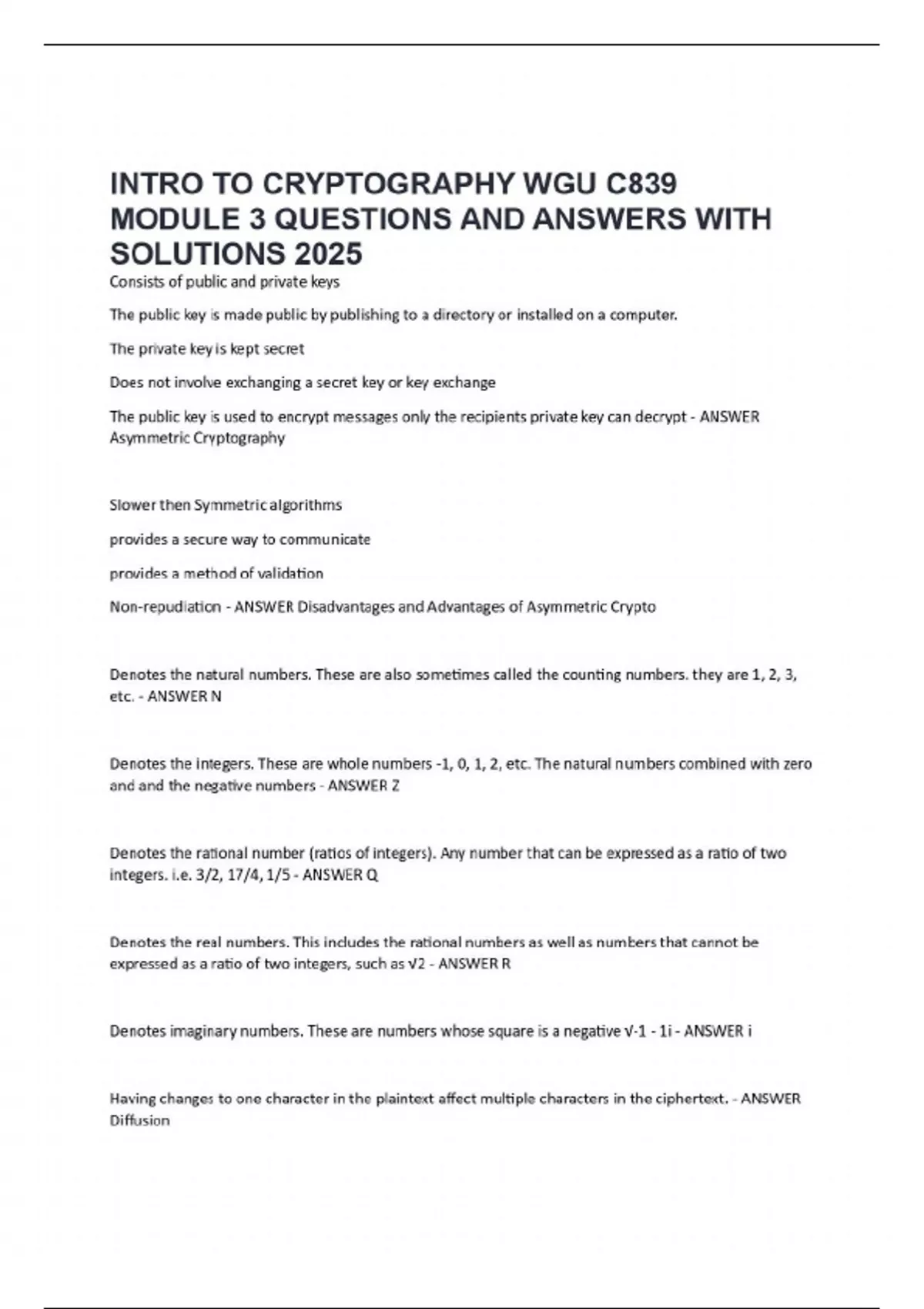 Consists of public and private keys The public key is made public by publishing to a directory or installed on a computer. The private key is kept secret Does not involve exchanging a secret key or key exchange The public key is used to encrypt messages only the recipients private key can decrypt - ANSWER Asymmetric Cryptography Slower then Symmetric algorithms provides a secure way to communicate provides a method of validation Non-repudiation - ANSWER Disadvantages and Advantages of Asymmetric Crypto Denotes the natural numbers. These are also sometimes called the counting numbers. they are 1, 2, 3, etc. - ANSWER N Denotes the integers. These are whole numbers -1, 0, 1, 2, etc. The natural numbers combined with zero and and the negative numbers - ANSWER Z Denotes the rational number (ratios of integers). Any number that can be expressed as a ratio of two integers. i.e. 3/2, 17/4, 1/5 - ANSWER Q Denotes the real numbers. This includes the rational numbers as well as numbers that cannot be expressed as a ratio of two integers, such as √2 - ANSWER R