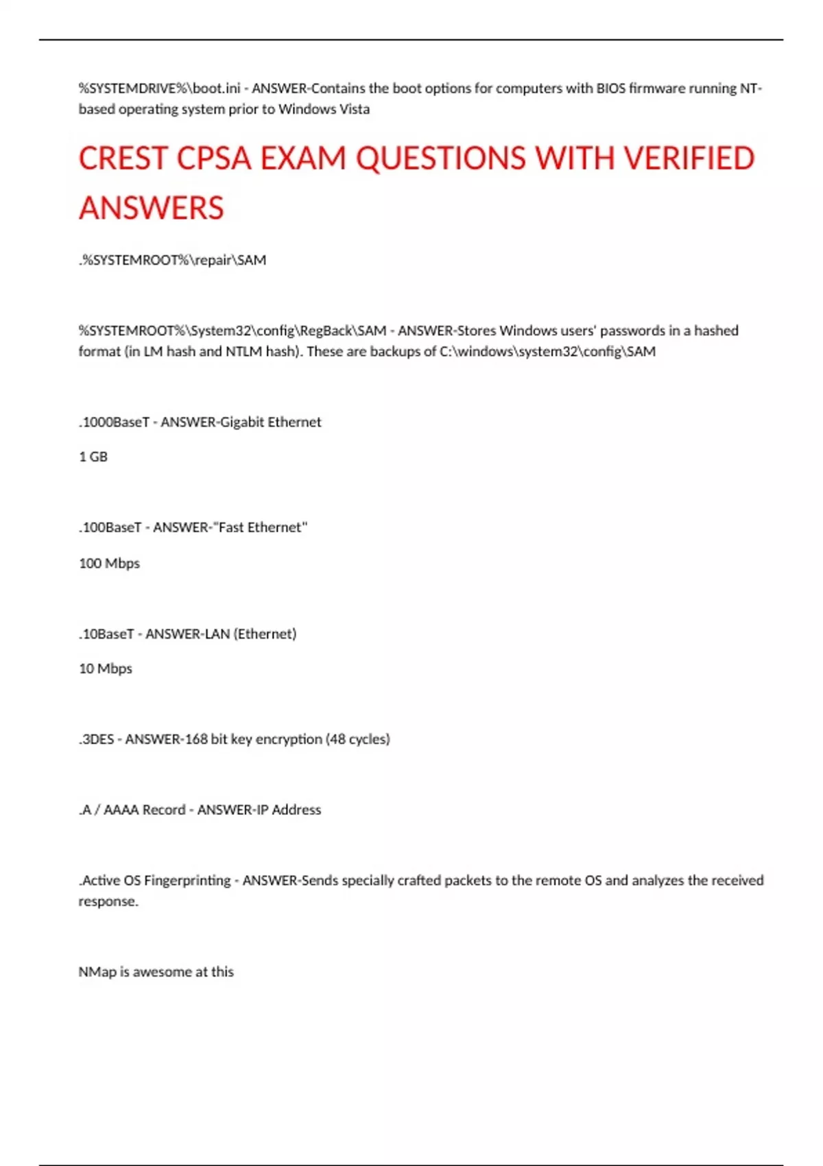 CREST CPSA EXAM QUESTIONS WITH VERIFIED ANSWERS .%SYSTEMROOT%repairSAM %SYSTEMROOT%System32configRegBackSAM - ANSWER-Stores Windows users' passwords in a hashed format (in LM hash and NTLM hash). These are backups of C:windowssystem32configSAM .1000BaseT - ANSWER-Gigabit Ethernet 1 GB .100BaseT - ANSWER-"Fast Ethernet" 100 Mbps .10BaseT - ANSWER-LAN (Ethernet) 10 Mbps .3DES - ANSWER-168 bit key encryption (48 cycles) .A / AAAA Record - ANSWER-IP Address .Active OS Fingerprinting - ANSWER-Sends specially crafted packets to the remote OS and analyzes the received response. NMap is awesome at this .AES (Advanced Encryption Standard) - ANSWER-A block cypher created in the late 1990s that uses a 128-bit block size and a 128-, 129-, or 256-bit key size. .Apache / Tomcat - ANSWER-Apache Web Servers .APIPA - ANSWER-Automatic Private Internet Protocol Addressing .ARP - ANSWER-Address Resolution Protocol .Asymmetric Encryption - ANSWER-RSA El Gamal ECC Eliptic Curve Diffie-Helman (Key Exchange) Paillier Merkle-Helman Cramer-Shoup .Base64 Encoding - ANSWER-An encoding scheme which represents any binary data using only printable ASCII characters. Usually used for encoding email attachments over SMTP .BGP - ANSWER-Border Gateway Protocol .Border Gateway Protocol (BGP) - ANSWER-A standardized exterior gateway protocol designed to exchange routing and reach-ability information among autonomous systems on the Internet. The protocol is classified as a path vector protocol. .CAT5 - ANSWER-type of cable that has the ability to transfer information from one computer to another .CDP - ANSWER-Cisco Discovery Protocol .Cisco Discovery Protocol (CDP) - ANSWER-a Cisco proprietary Layer 2 protocol to gather information about neighboring Cisco devices .Cisco Password Encryption - ANSWER-secret 4 : Crappy SHA256 secret 5 : Salted MD5 secret 7: Crappy Cisco encryption to prevent cleartext in the config secret 8 : PBKDF2 (Password-Based Key Derivation Function 2) *bruteforce target* secret 9 : scrypt (BINGO) .Classful IP Range : Class A - ANSWER-128 Networks (2^7), 16,777,216 Addresses per network (2^24) Range : 0.0.0.0-127.0.0.0 Default Subnet Mask : 255.0.0.0 CIDR Notation : /8 .Classful IP Range : Class B - ANSWER-16,384 Networks (2^14), 65,536 Addresses per network (2^16) Range : 128.0.0.0-191.255.0.0 Default Subnet Mask : 255.255.0.0 CIDR Notation : /16 .Classful IP Range : Class C - ANSWER-2,097,152 Networks (2^21), 256 Addresses per network (2^8)