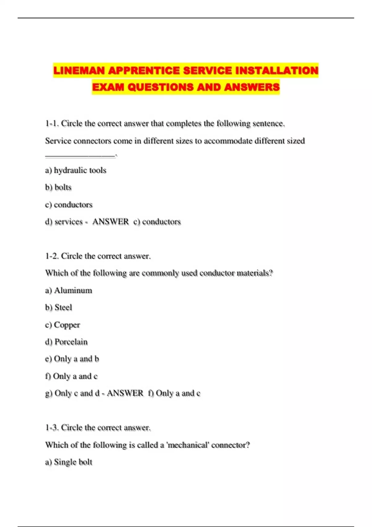 LINEMAN APPRENTICE SERVICE INSTALLATION EXAM QUESTIONS AND ANSWERS....
