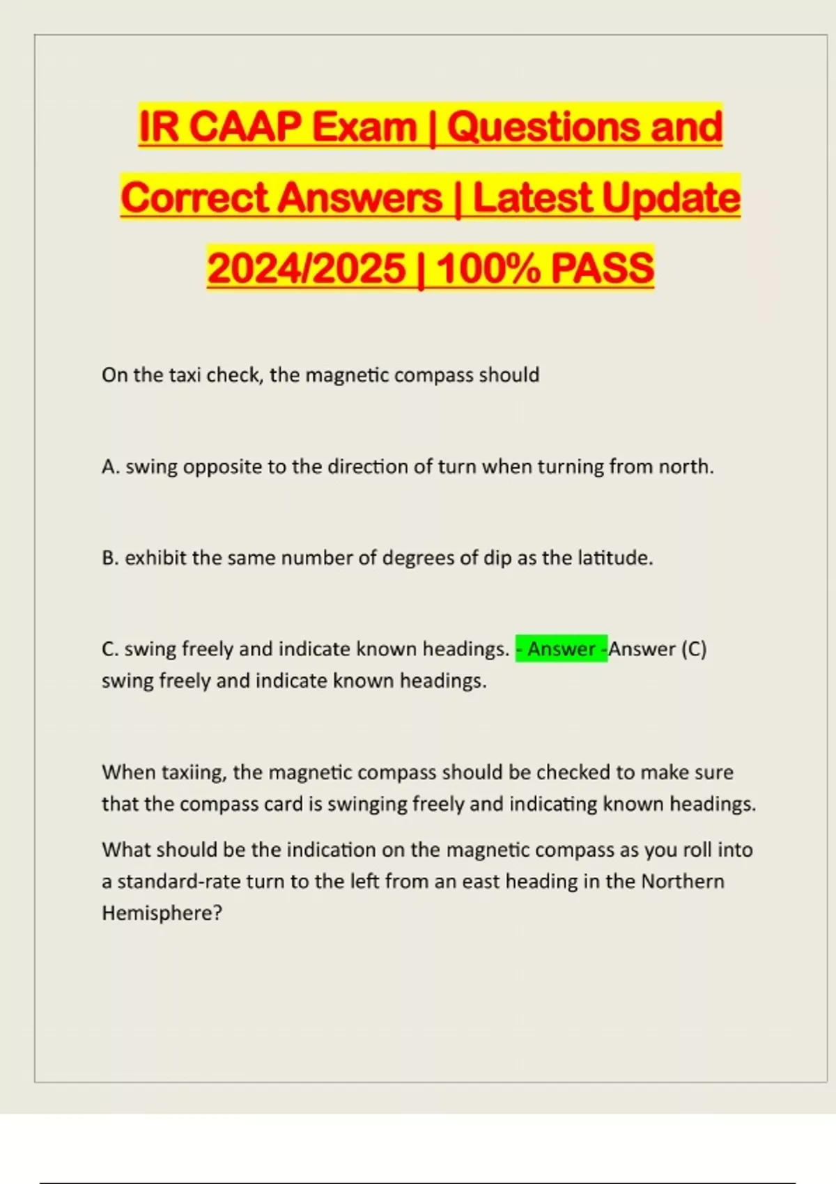 IR CAAP Exam | Questions and Correct Answers | Latest Update 2024/2025 | 100% PASS On the taxi check, the magnetic compass should A. swing opposite to the direction of turn when turning from north. B. exhibit the same number of degrees of dip as the latitude. C. swing freely and indicate known headings. - Answer -Answer (C) swing freely and indicate known headings. When taxiing, the magnetic compass should be checked to make sure that the compass card is swinging freely and indicating known headings. What should be the indication on the magnetic compass as you roll into a standard-rate turn to the left from an east heading in the Northern Hemisphere?A. The compass will remain on east for a short time, then gradually catch up to the magnetic heading of the aircraft. B. The compass will indicate the approximate correct magnetic heading if the roll into the turn is smooth. C. The compass will initially indicate a turn to the right. - Answer - Answer (B) The compass will indicate the approximate correct magnetic heading if the roll into the turn is smooth. If you roll into a smooth, coordinated, standard-rate turn to the left or right from an east or west heading, the compass will indicate the approximate correct magnetic heading. There are no turning errors on turns from east or west headings. What should be the indication on the magnetic compass as you roll into a standard rate turn to the right from an easterly heading in the Northern Hemisphere? A. The compass will indicate the approximate correct magnetic head