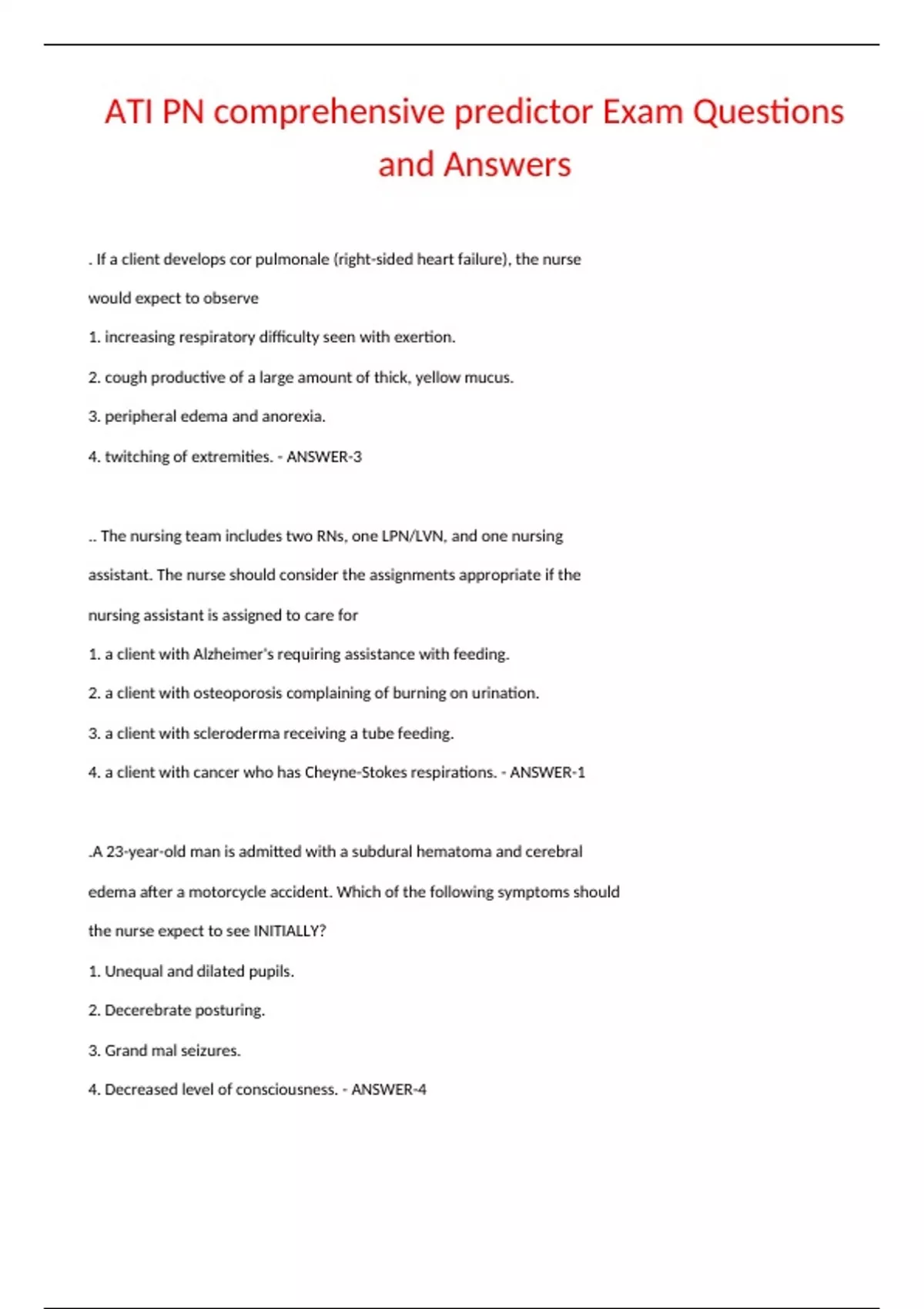 ATI PN comprehensive predictor Exam Questions and Answers . If a client develops cor pulmonale (right-sided heart failure), the nurse would expect to observe 1. increasing respiratory difficulty seen with exertion. 2. cough productive of a large amount of thick, yellow mucus. 3. peripheral edema and anorexia. 4. twitching of extremities. - ANSWER-3 .. The nursing team includes two RNs, one LPN/LVN, and one nursing assistant. The nurse should consider the assignments appropriate if the nursing assistant is assigned to care for 1. a client with Alzheimer's requiring assistance with feeding. 2. a client with osteoporosis complaining of burning on urination. 3. a client with scleroderma receiving a tube feeding. 4. a client with cancer who has Cheyne-Stokes respirations. - ANSWER-1 .A 23-year-old man is admitted with a subdural hematoma and cerebral edema after a motorcycle accident. Which of the following symptoms should the nurse expect to see INITIALLY? 1. Unequal and dilated pupils. 2. Decerebrate posturing. 3. Grand mal seizures. 4. Decreased level of consciousness. - ANSWER-4 .A 23-year-old woman at 32-weeks gestation is seen in the outpatient clinic. Which of the following findings, if assessed by the nurse, would indicate a possible complication? 1. The client's urine test is positive for glucose and acetone. 2. The client has 1+ pedal edema in both feet at the end of the day. 3. The client complains of an increase in vaginal discharge. 4. The client says she feels pressure against her diaphragm when the baby moves. - ANSWER-1 .A 38-year-old woman is returned to her room after a subtotal thyroidectomy for treatment of hyperthyroidism. Which of the following, if found by the nurse at the patient's bedside, is nonessential? 1. Potassium chloride for IV administration. 2. Calcium gluconate for IV administration. 3. Tracheostomy set-up. 4. Suction equipment. - ANSWER-1 .A 59-year-old woman with bipolar disorder is receiving haloperidol (Haldol) 2 mg PO tid. She tells the nurse, "Milk is coming out of my breasts." Which of the following responses by the nurse is BEST? 1. "You are seeing things that aren't real." 2. "Why don't we go make some fudge." 3. "You are experiencing a side effect of Haldol." 4. "I'll contact your physician to change your medication." - ANSWER-3 .A 69-year-old client is undergoing his second exchange of intermittent peritoneal dialysis (IPD). Which of the following would require an intervention by the nurse? 1. The client complains of pain during the inflow of the dialysate. 2. The client complains of constipation. 3. The dialysate outflow is cloudy. 4. There is blood-tinged fluid around the intra-abdominal catheter. - ANSWER-3 .A charge nurse is discussing the responsibility of nurses carig for clients who have C. difficile. Which of the following information should the nurse include in the teaching? a) Assign the client to a room with a negative air-flow system b) Use alcohol-based hand sanitizer when leaving the clients room c) clean contaminated surfaces in the clients room with a phenol solution d) have family members wear a gown and gloves when visiting - ANSWER-D .A client diagnosed with dementia wanders the halls of the locked nursing unit during the day. To ensure the client's safety while walking in the halls, the nurse should do which of the following? 1. Administer PRN haloperidol (Haldol) to decrease the need to walk. 2. Assess the client's gait for steadiness. 3. Restrain the client in a geriatric chair. 4. Administer PRN lorazepam (Ativan) to provide sedation. - ANSWER-2 .A client has a history of oliguria, hypertension, and peripheral edema. Current lab values are: BUN -25, K+ -4.0 mEq/L. Which nutrient should be restricted in the client's diet? 1. Protein. 2. Fats. 3. Carbohydrates. 4. Magnesium. - ANSWER-1 .a client has a new prescription for spironilactone ( aldactone ) which of the following laboratory value should the nurse recognized as a reason to withhold the morning dose of the medication and notify the provider - ANSWER-serum potassium 5.2 .a client has prescription for valproic ( Depakote) which of the following laboratory value should the nurse anticipate monitor for the client taking this medication - ANSWER-thrombocytes, amylase count and liver function test .A client is admitted with a diagnosis of acute appendicitis. When assessing the abdomen, the nurse would expect to find rebound tenderness at which location? a) Left lower quadrant b) Left upper quadrant c) Right upper quadrant d) Right lower quadrant - ANSWER-D .A client is being discharged with sublingual nitroglycerin (Nitrostat). The client should be cautioned by the nurse to 1. take the medication five minutes after the pain has started. 2. stop taking the medication if a stinging sensation is absent. 3. take the medication on an empty stomach. 4. avoid abrupt changes in posture. - ANSWER-4 .A client is given morphine 6 mg IV push for postoperative pain. Following administration of this drug, the nurse observes the following: pulse 68, respirations 8, BP 100/68, client sleeping quietly. Which of the following nursing actions is MOST appropriate? 1. Allow the client to sleep undisturbed. 2. Administer oxygen via facemask or nasal prongs. 3. Administer naloxone (Narcan). 4. Place epinephrine 1:1,000 at the bedside. - ANSWER-3 .A client is receiving total parenteral nutrition (TPN). To determine the client's tolerance of this treatment, the nurse should assess for which of the following? 1. A significant increase in pulse rate. 2. A decrease in diastolic blood pressure. 3. Temperature in excess of 98.6°F (37°C). 4. Urine output of at least 30 cc per hour. - ANSWER-4 .A client is scheduled for a left lower lobectomy. The physician has ordered diazepam (Valium) 2 mg IM for anxiety. The nurse would determine that the medication is appropriate if the client displays which of the following symptoms? 1. Agitation and decreased level of consciousness. 2. Lethargy and decreased respir