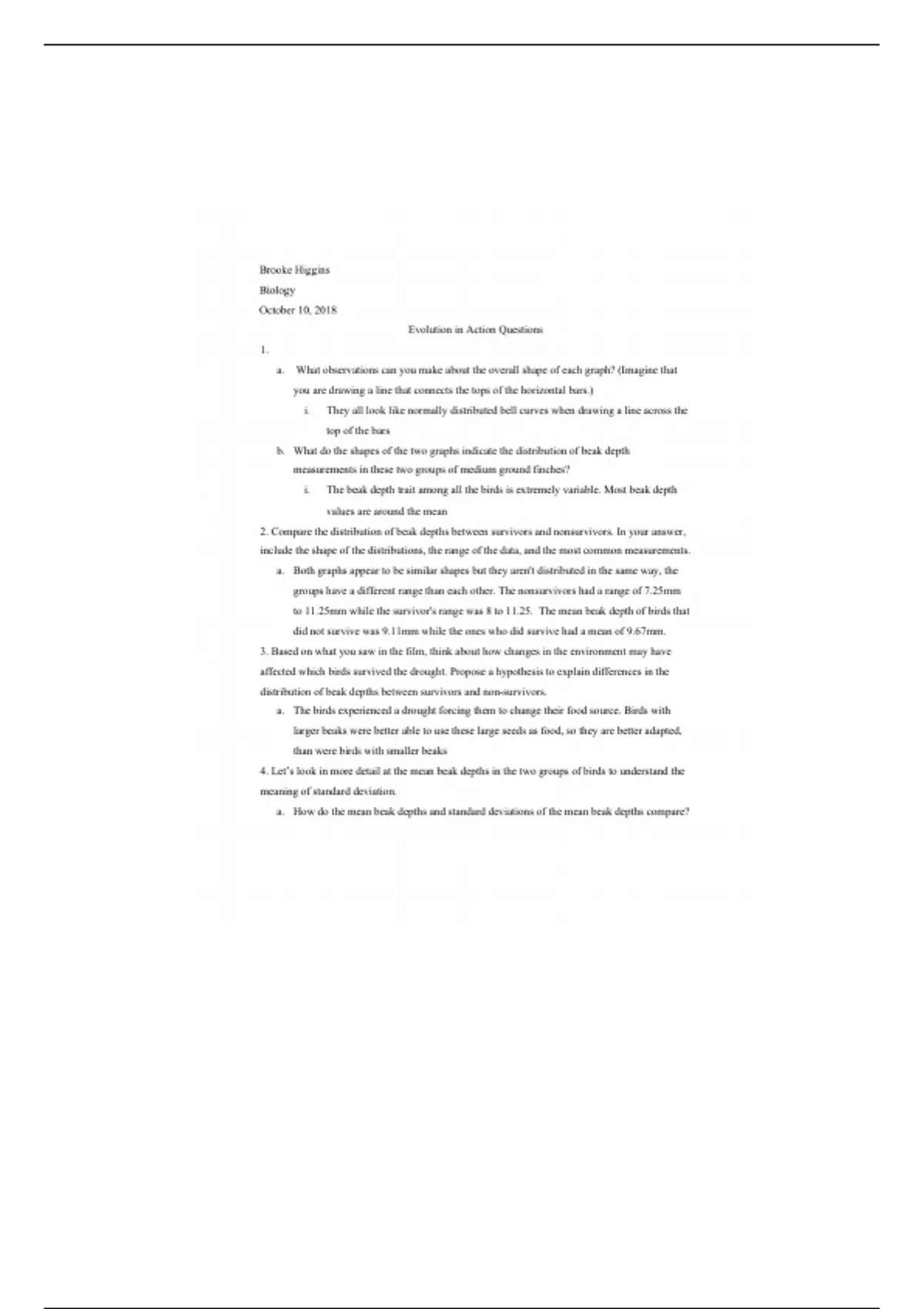 to 11.25mm while the survivor's range was 8 to 11.25. The mean beak depth of birds that
