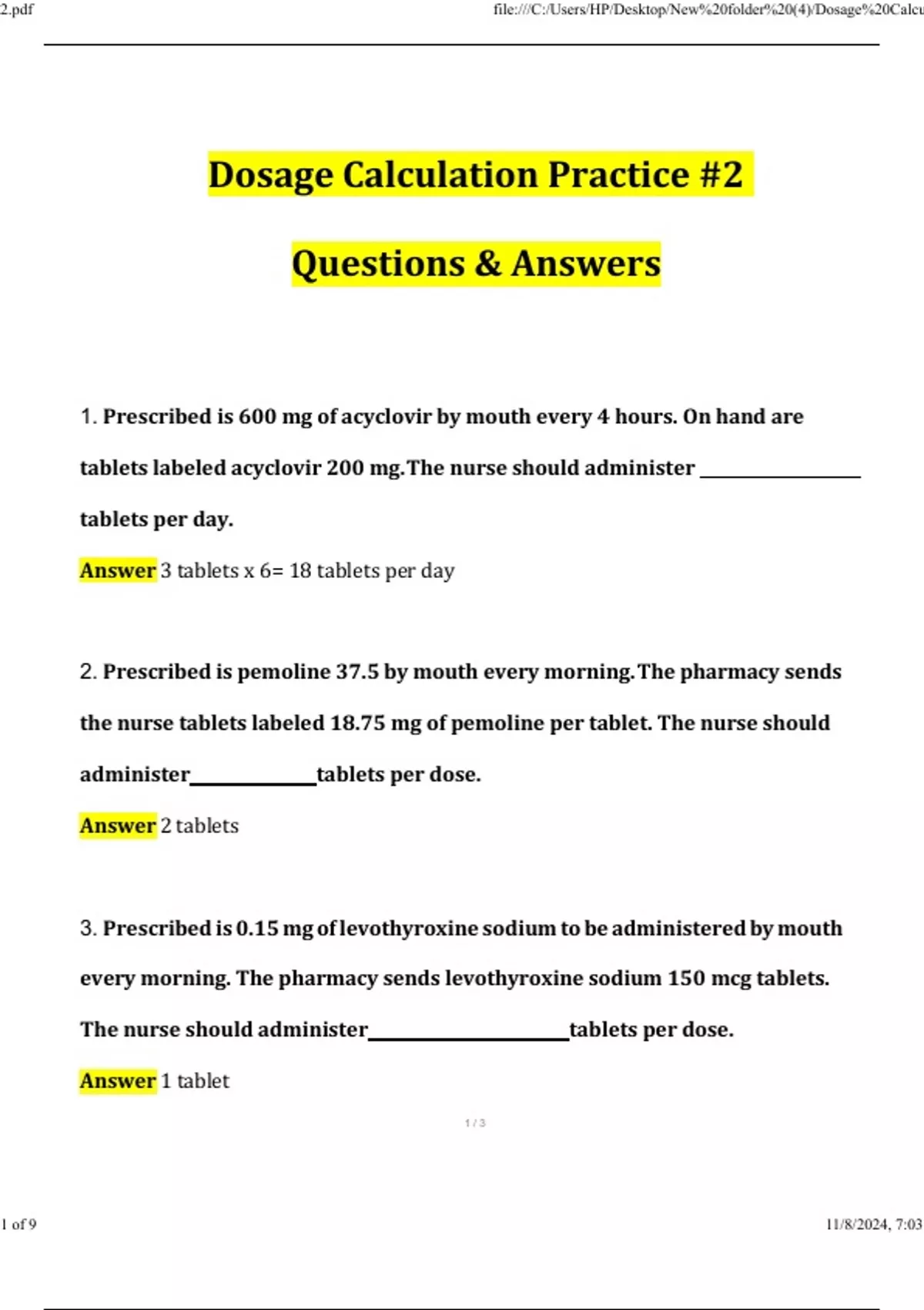 Dosage Calculation Practice 2 Exam Updated Questions and Answers (2024/2025) (Verified Answers)