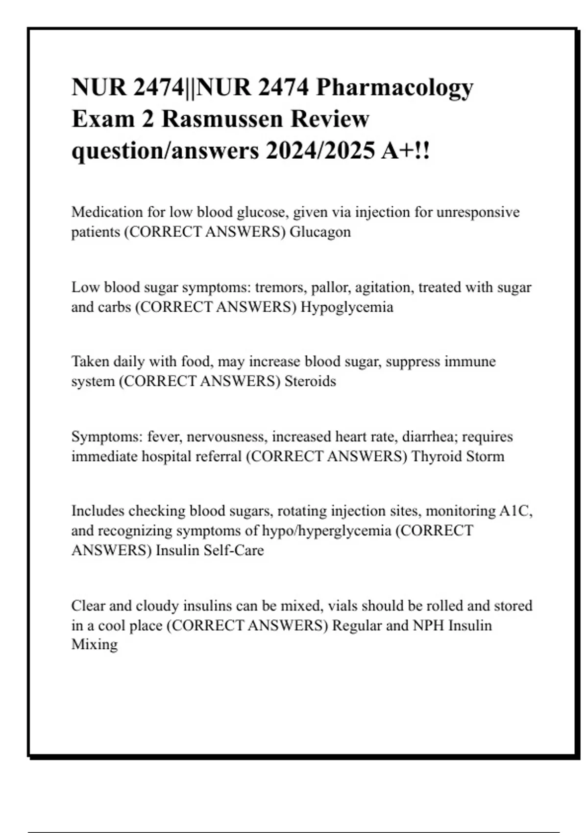 NUR 2474||NUR 2474 Pharmacology Exam 2 Rasmussen Review question/answers 2024/2025 A+!!