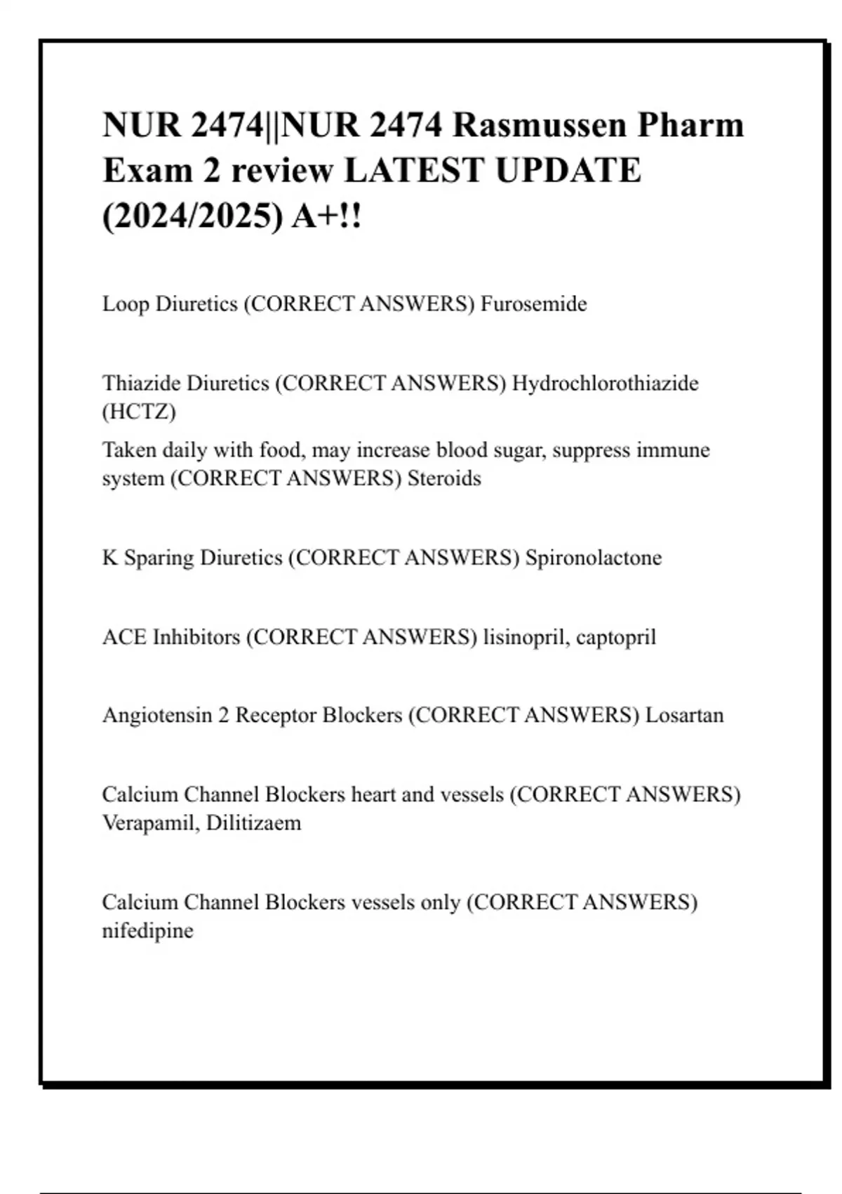 K Sparing Diuretics (CORRECT ANSWERS) Spironolactone