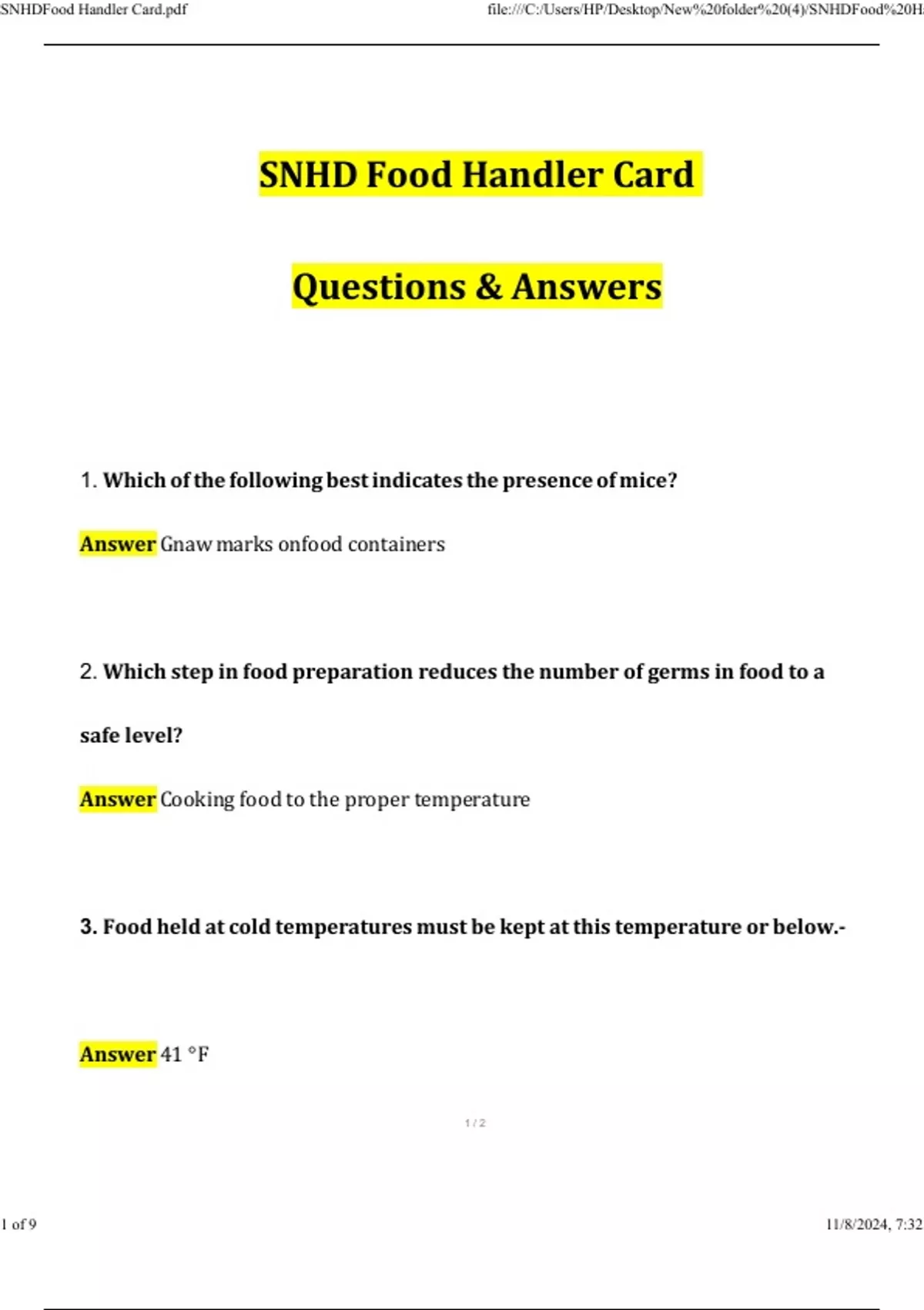 SNHD Food Handler Card 2024 Updated Questions and Answers (2024/2025) (Verified Answers)