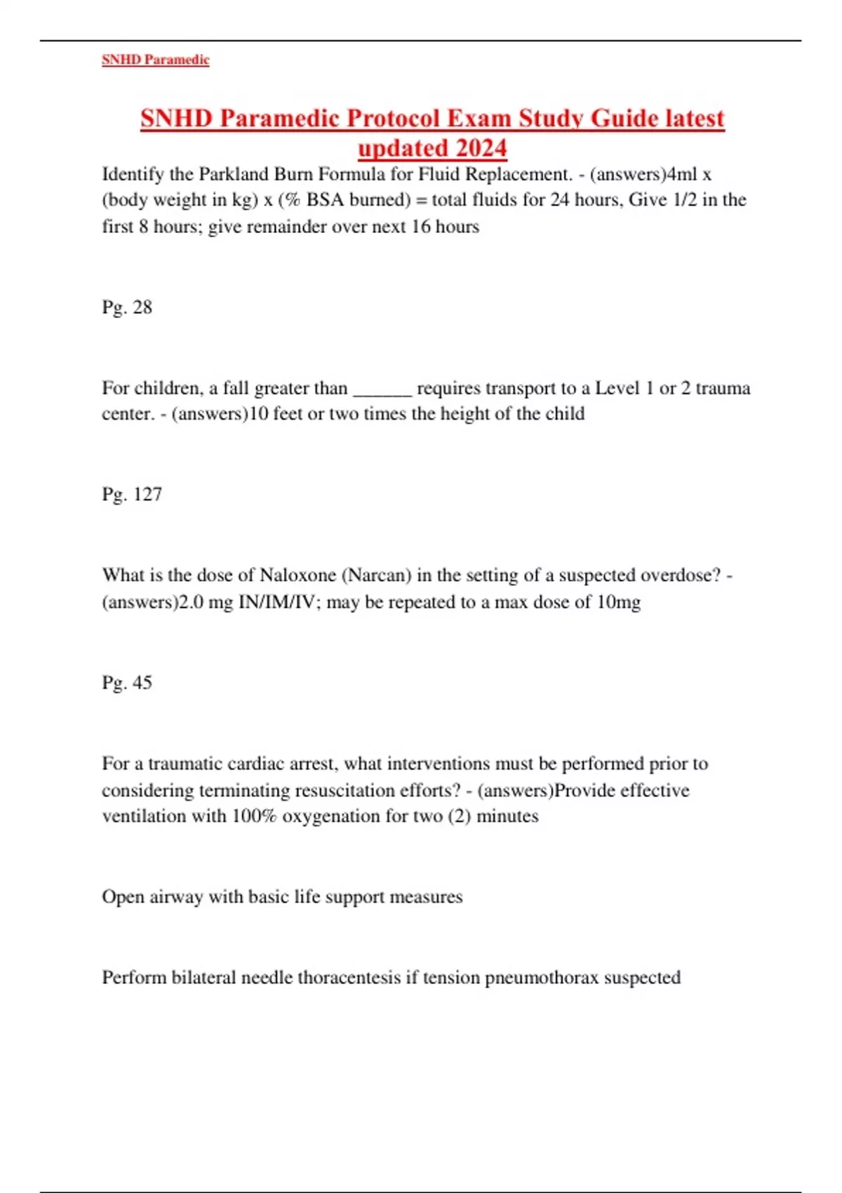 SNHD Paramedic Protocol Exam Study Guide latest