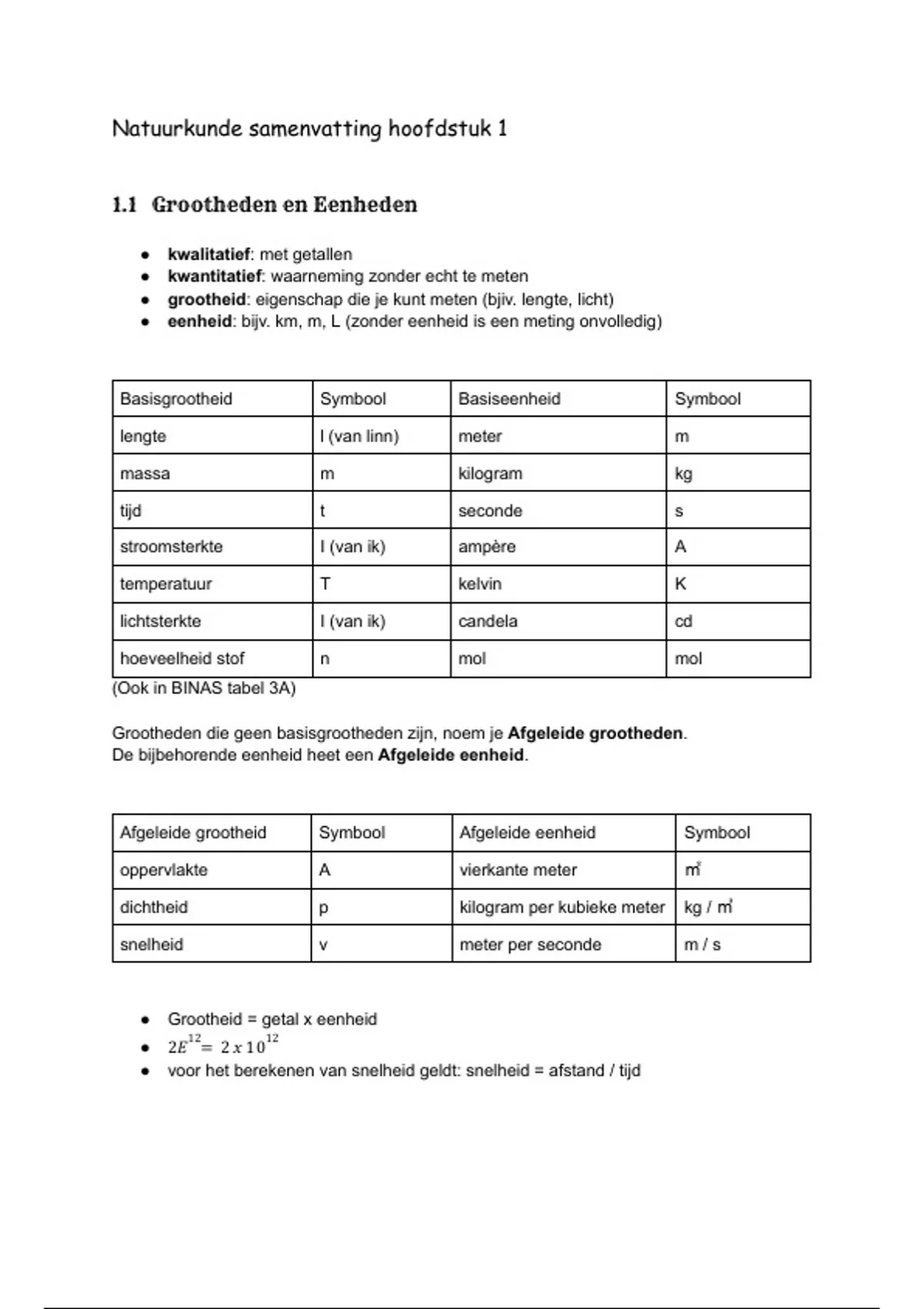 Een complete samenvatting over de basis van natuurkunde. Een overzicht over grootheden en eenheden, de wetenschappelijke notatie, meetonzekerheid, significante cijfers met vuistregels, interpoleren en extrapoleren in een tabel en soorten verbanden. Naast uitleg zijn er ook voorbeelden toegevoegd om het beeld nog completer en duidelijker te maken. Kortom, deze samenvatting zorgt ervoor dat je een goed overzicht van de basis van natuurkunde krijgt en zo vertrouwd raakt met de stof!