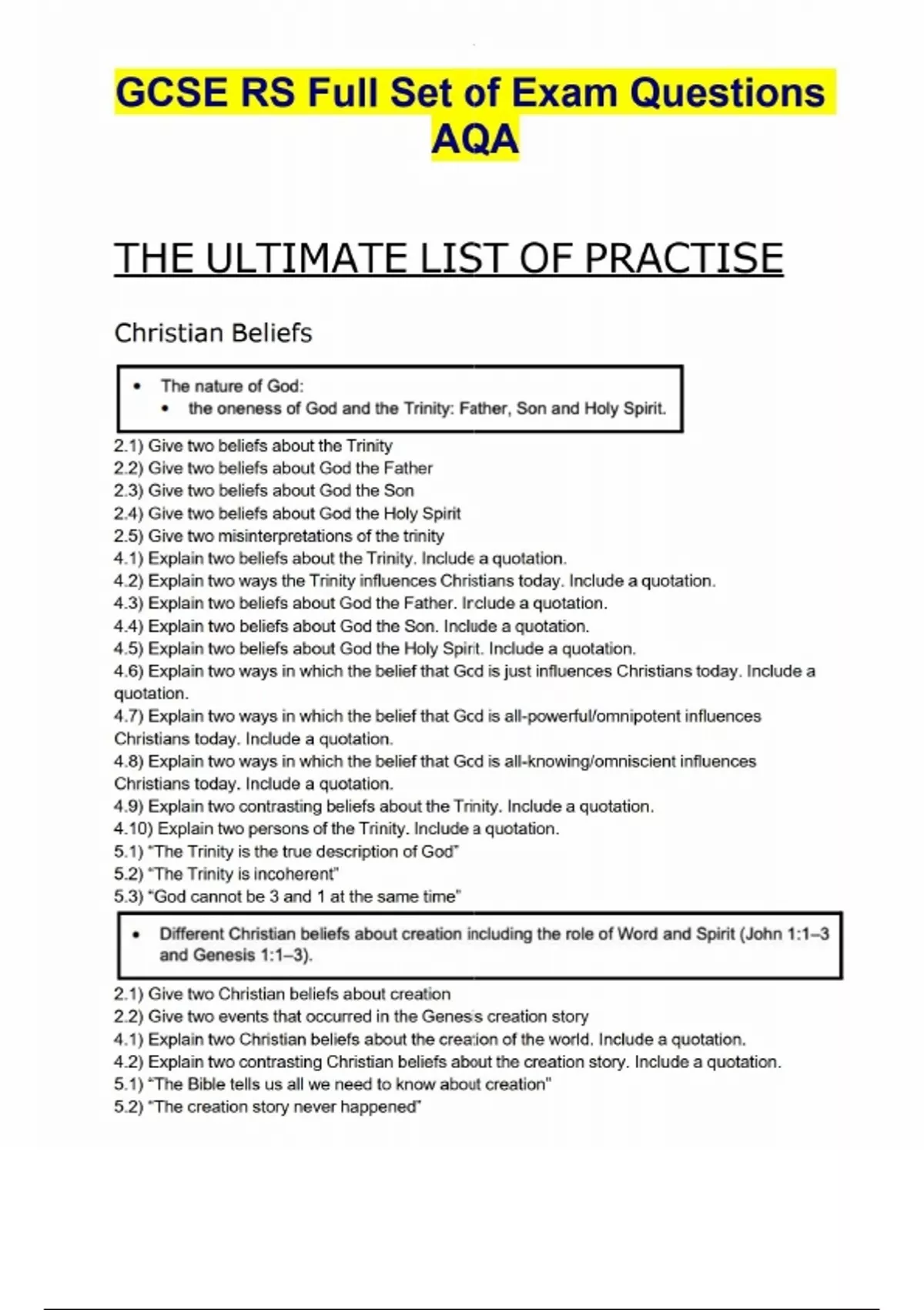 GCSE RS Full Set of Exam Questions AQA THE ULTIMATE LIST OF PRACTISE Christian Beliefs 2.1) Give two beliefs about the Trinity 2.2) Give two beliefs about God the Father 2.3) Give two beliefs about God the Son 2.4) Give two beliefs about God the Holy Spirit 2.5) Give two misinterpretations of the trinity 4.1) Explain two beliefs about the Trinity. Include a quotation. 4.2) Explain two ways the Trinity influences Christians today. Include a quotation. 4.3) Explain two beliefs about God the Father. Include a quotation. 4.4) Explain two beliefs about God the Son. Include a quotation. 4.5) Explain two beliefs about God the Holy Spirit. Include a quotation. 4.6) Explain two ways in which the belief that God is just influences Christians today. Include a quotation. 4.7) Explain two ways in which the belief that God is all-powerful/omnipotent influences Christians today. Include a quotation. 4.8) Explain two ways in which the belief that God is all-knowing/omniscient influences Christians today. Include a quotation. 4.9) Explain two contrasting beliefs about the Trinity. Include a quotation. 4.10) Explain two persons of the Trinity. Include a quotation. 5.1) “The Trinity is the true description of God” 5.2) “The Trinity is incoherent” 5.3) “God cannot be 3 and 1 at the same time” 2.1) Give two Christian beliefs about creation 2.2) Give two events that occurred in the Genesis creation story 4.1) Explain two Christian beliefs about the creation of the world. Include a quotation. 4.2) Explain two contrasting C ... Purchase document to see full attachment