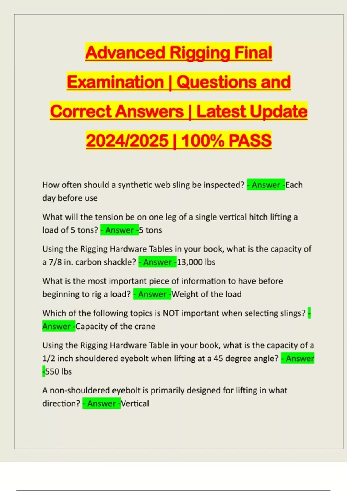 Advanced Rigging Final Examination | Questions and Correct Answers | Latest Update 2024/2025 | 100% PASS How often should a synthetic web sling be inspected? - Answer -Each day before use What will the tension be on one leg of a single vertical hitch lifting a load of 5 tons? - Answer -5 tons Using the Rigging Hardware Tables in your book, what is the capacity of a 7/8 in. carbon shackle? - Answer -13,000 lbs What is the most important piece of information to have before beginning to rig a load? - Answer -Weight of the load Which of the following topics is NOT important when selecting slings? - Answer -Capacity of the crane Using the Rigging Hardware Table in your book, what is the capacity of a 1/2 inch shouldered eyebolt when lifting at a 45 degree angle? - Answer -550 lbs A non-shouldered eyebolt is primarily designed for lifting in w