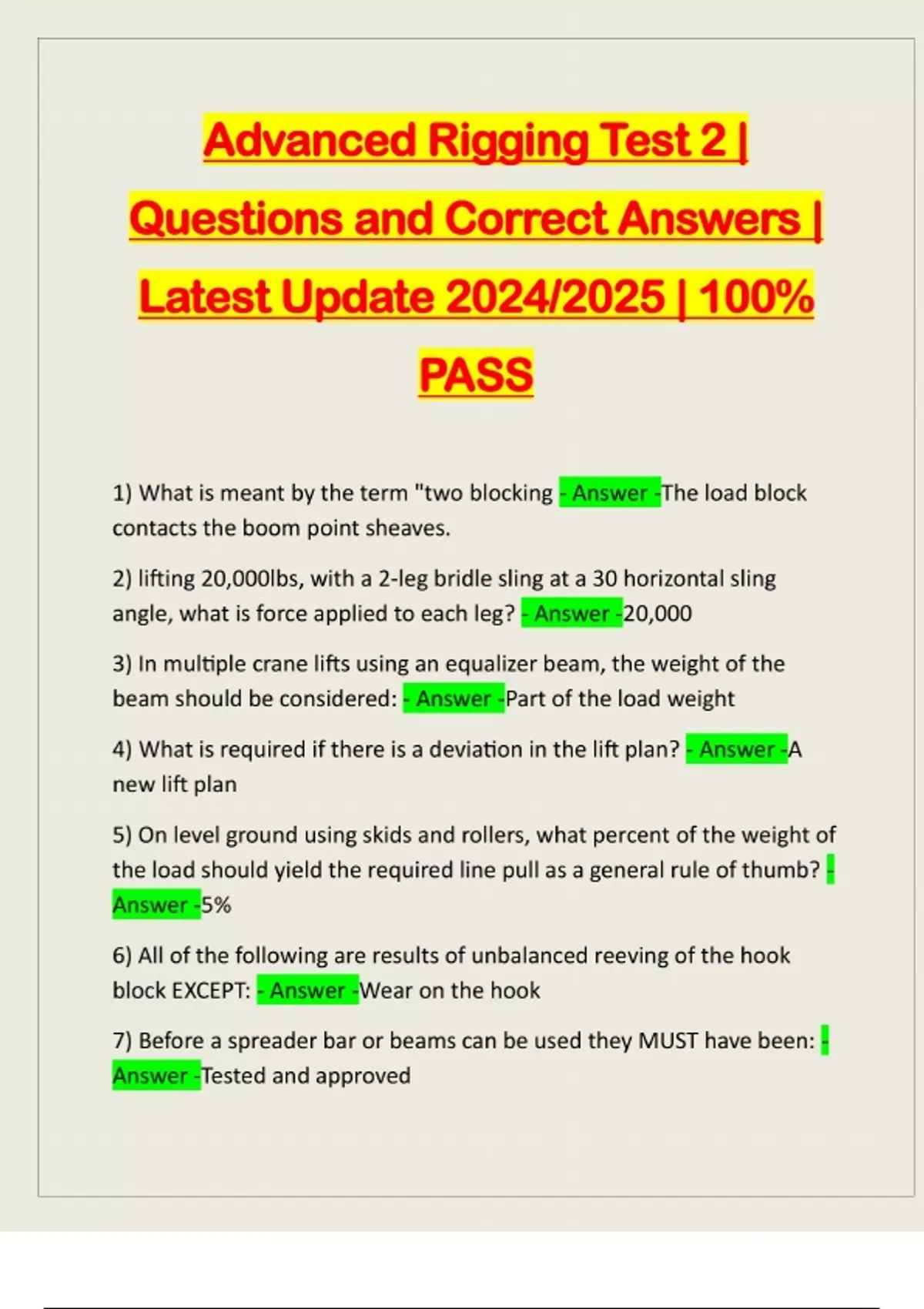 Advanced Rigging Test 2 | Questions and Correct Answers | Latest Update 2024/2025 | 100% PASS