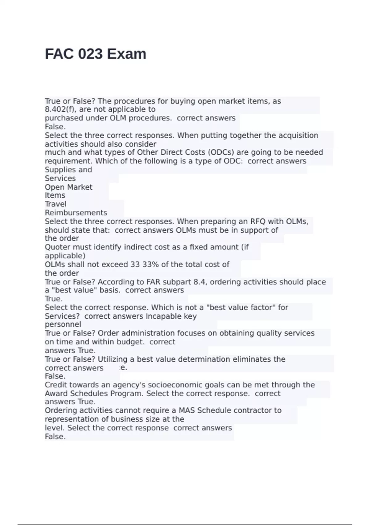 True or False? The procedures for buying open market items, as prescribed at FAR 8.402(f), are not applicable to items purchased under OLM procedures. correct answers False. Select the three correct responses. When putting together the acquisition plan, ordering activities should also consider how much and what types of Other Direct Costs (ODCs) are going to be needed to meet the requirement. Which of the following is a type of ODC: correct answers Ancillary Supplies and Services Open Market Items Travel Reimbursements Select the three correct responses. When preparing an RFQ with OLMs, the RFQ should state that: correct answers OLMs must be in support of the order Quoter must identify indirect cost as a fixed amount (if applicable) OLMs shall not exceed 33 33% of the total cost of the order True or False? According to FAR subpart 8.4, ordering activities should place orders on a "best value" basis. correct answers True. Select the correct response. Which is not a "best value factor" for Procurement of Services? correct answers Incapable key personnel True or False? Order administration focuses on obtaining quality services and supplies on time and within budget. correct answers True. True or False? Utilizing a best value determination eliminates the consideration of price. correct answers False. Credit towards an agency's socioeconomic goals can be met through the GSA Multiple Award Schedules Program. Select the correct response. correct answers True. Ordering activities cannot require a MAS Schedule contractor to submit a re-representation of business size at the order level. Select the correct response correct answers False. The Multiple Award Schedule (MAS) contract size standard certification is generally