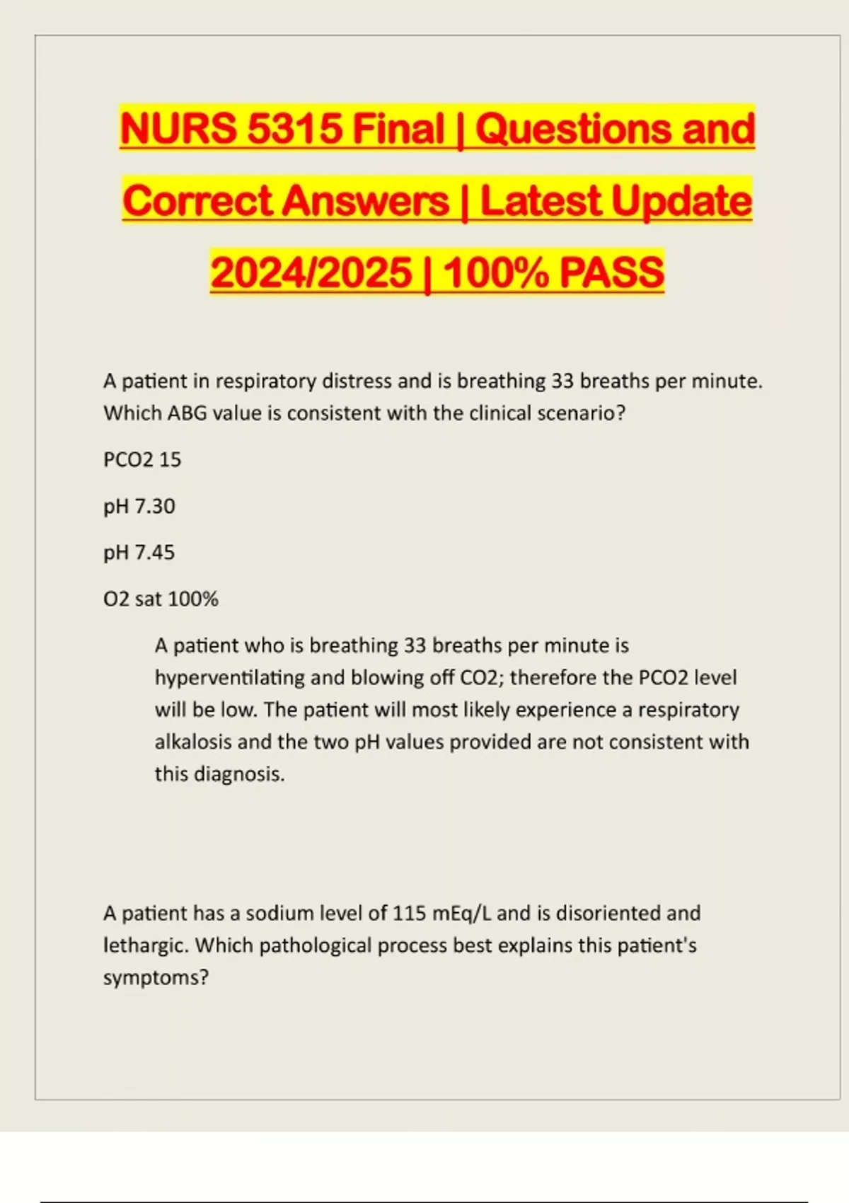 NURS 5315 Final | Questions and Correct Answers | Latest Update 2024/2025 | 100% PASS A patient in respiratory distress and is breathing 33 breaths per minute. Which ABG value is consistent with the clinical scenario? PCO2 15 pH 7.30 pH 7.45 O2 sat 100% A patient who is breathing 33 breaths per minute is hyperventilating and blowing off CO2; therefore the PCO2 level will be low. The patient will most likely experience a respiratory alkalosis and the two pH values provided are not consistent with this diagnosis. A patient has a sodium level of 115 mEq/L and is disoriented and lethargic. Which pathological process best explains this patient's symptoms?a. The action potential has become hyperpolarized. b. Water has shifted into the neurons and caused them to swell. c. Water has shifted into the vascular space and dehydrated the neurons. d. The action potential has become hypopolarized. b. The cause of neurologic symptoms associated with a sodium imbalance is directly related to fl