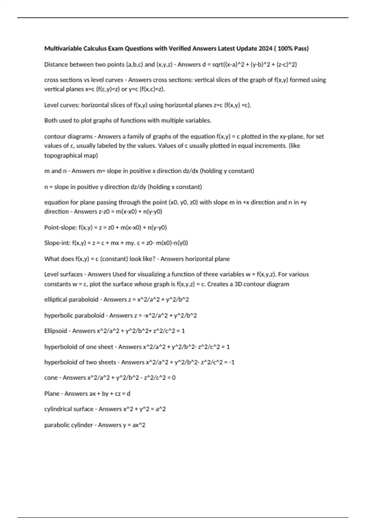 Multivariable Calculus Exam Questions with Verified Answers Latest Update 2024 ( 100% Pass) Distance between two points (a,b,c) and (x,y,z) - Answers d = sqrt((x-a)^2 + (y-b)^2 + (z-c)^2) cross sections vs level curves - Answers cross sections: vertical slices of the graph of f(x,y) formed using vertical planes x=c (f(c,y)=z) or y=c (f(x,c)=z). Level curves: horizontal slices of f(x,y) using horizontal planes z=c (f(x,y) =c). Both used to plot graphs of functions with multiple variables. contour diagrams - Answers a family of graphs of the equation f(x,y) = c plotted in the xy-plane, for set values of c, usually labeled by the values. Values of c usually plotted in equal increments. (like topographical map) m and n - Answers m= slope in positive x direction dz/dx (holding y constant) n = slope in positive y direction dz/dy (holding x constant) equation for plane passing through the point (x0, y0, z0) with slope m in +x direction and n in +y direction - Answers z-z0 = m(x-x0) + n(y-y0) Point-slope: f(x,y) = z = z0 + m(x-x0) + n(y-y0) Slope-int: f(x,y) = z = c + mx + my. c = z0- m(x0)-n(y0) What does f(x,y) = c (constant) look like? - Answers horizontal plane Level surfaces - Answers Used for visualizing a function of three variables w = f(x,y,z). For various constants w = c, plot the surface whose graph is f(x,y,z) = c. Creates a 3D contour diagram elliptical paraboloid - Answers z = x^2/a^2 + y^2/b^2 hyperbolic paraboloid - Answers z = -x^2/a^2 + y^2/b^2 Ellipsoid - Answers x^2/a^2 + y^2/b^2+ z^2/c^2 = 1 hyperboloid of one sheet - Answers x^2/a^2 + y^2/b^2- z^2/c^2 = 1 hyperboloid of two sheets - Answers x^2/a^2 + y^2/b^2- z^2/c^2 = -1 cone - Answers x^2/a^2 + y^2/b^2 - z^2/c^2 = 0 Plane - Answers ax + by + cz = d cylindrical surface - Answers x^2 + y^2 = a^2 parabolic cylinder - Answers y = ax^2 limit - Answers lim (x,y) -> (a,b) f(x,y) = L , if f(x,y) can be made as close to L as we please whenever the distance from point (x,y) to the point (a,b) is sufficiently small, but not zero Finding the limit of a function along a line, or another function (ex. y = mx, y = x^2) - Answers Plug function into each y in the larger function and evaluate the limit at the point. If the limits approaching a point along multiple different functions differ the limit does not exist. displacement vector - Answers vector representing displacement i.e. change from a point P to point Q. unit vector - Answers has magnitude of 1 unit how to add, subtract, scalar multiply vectorys - Answers add, subtract and scalar multiple by components magnitude - Answers ||*v*|| = sqrt(v1^2 + v2^2 + v3^2) ||c*v*|| = |c|||*v*|| algebraic properties of vectors: commutativity, associativity, distributivity, identities - Answers comm: *v* + *w* = *w* + *v* assoc:(*u* + *v*) + *w* = *u* + (*v* + *w*) a(b*v*) = (ab)*v* dist: (a + b)*v* = a*v* + b*v* a(*v* + *w*) = a*v* + a*w* ident:1*v* =*v* *v* + *0* = *v* 0*v* = o *w* - *v* = *w* + (-1)*v* dot product - Answers *v* • *w* = ||*v*||||*w*||cos(x) where x is the angle between the vectors. = v1w1 + v2w2 + v3w3 magnitude using dot product - Answers *v* • *v* = ||*v*||^2 angle between two vectors (x) - Answers cos(x) = *v* • *w*/||*v*||||*w*|| perpendicularity using dot product - Answers if *v* • *w* = 0 then *v* and *w* are perpendicular algebra of dot product: commutative, associative, distributive - Answers comm: *v* • *w* = *w* • *v* assoc: *v* • (c*w*) = c(*v* • *w*) = (c*v*) • *w* dist: (*v* + *w*) • *u* = *v* • *u* + *w* • *u* normal vector - Answers vector perpendicular to a plane projection of v onto w (v-parallel and v-perpendicular) - Answers *v*-parallel = c*w* =(*v* • *w*/*w* • *w*) *w* *v*-perp = *v* - *v*-parallel cross product - Answers *v* x *w* = (v2w3 - v3w2)i + (v3w1 - v1w3)j + (v1w2 - v2w1)k ||*v* x *w*|| = ||*v*||||*w*||sin(x) algebra of cross product: commutative, associative, distributive - Answers comm: *w* x *v* = -(*v* x *w8) assoc: (c*v*) x *w* = c(*v* x *w*) = *v* x (c*w*) dist: *u* x (*v* + *w*) = *u* x *v* + *u* x *w* area of parallelogram with edges v and w - Answers ||*v* x *w*|| volume of a parallelepiped with edges a, b ,c - Answers |(*b* x *c*) • *a*|