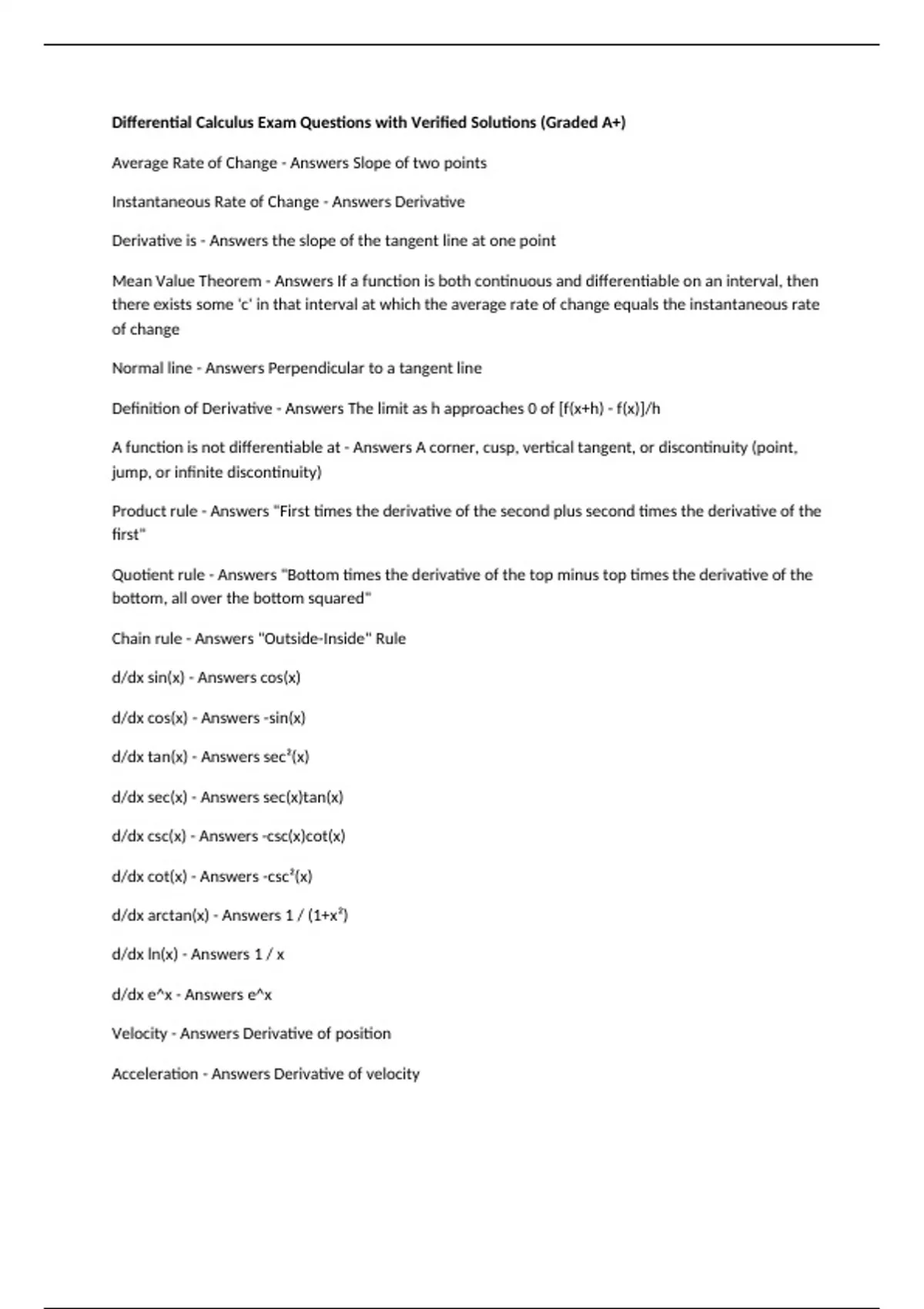 Differential Calculus Exam Questions with Verified Solutions (Graded A+) Average Rate of Change - Answers Slope of two points Instantaneous Rate of Change - Answers Derivative Derivative is - Answers the slope of the tangent line at one point Mean Value Theorem - Answers If a function is both continuous and differentiable on an interval, then there exists some 'c' in that interval at which the average rate of change equals the instantaneous rate of change Normal line - Answers Perpendicular to a tangent line Definition of Derivative - Answers The limit as h approaches 0 of [f(x+h) - f(x)]/h A function is not differentiable at - Answers A corner, cusp, vertical tangent, or discontinuity (point, jump, or infinite discontinuity) Product rule - Answers "First times the derivative of the second plus second times the derivative of the first" Quotient rule - Answers "Bottom times the derivative of the top minus top times the derivative of the bottom, all over the bottom squared" Chain rule - Answers "Outside-Inside" Rule d/dx sin(x) - Answers cos(x) d/dx cos(x) - Answers -sin(x) d/dx tan(x) - Answers sec²(x)