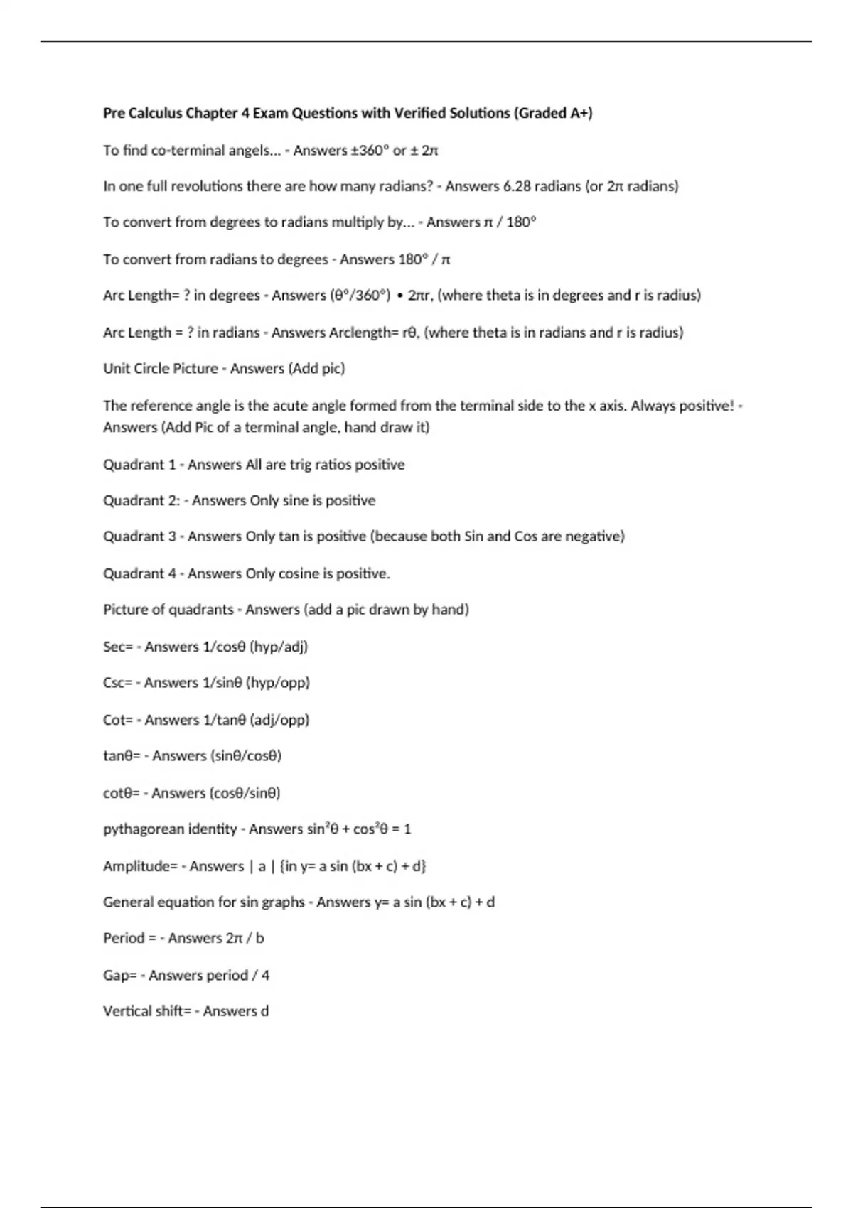 Pre Calculus Chapter 4 Exam Questions with Verified Solutions (Graded A+) To find co-terminal angels... - Answers ±360º or ± 2π In one full revolutions there are how many radians? - Answers 6.28 radians (or 2π radians) To convert from degrees to radians multiply by... - Answers π / 180º To convert from radians to degrees - Answers 180º / π Arc Length= ? in degrees - Answers (θº/360º) ∙ 2πr, (where theta is in degrees and r is radius) Arc Length = ? in radians - Answers Arclength= rθ, (where theta is in radians and r is radius) Unit Circle Picture - Answers (Add pic) The reference angle is the acute angle formed from the terminal side to the x axis. Always positive! - Answers (Add Pic of a terminal angle, hand draw it) Quadrant 1 - Answers All are trig ratios positive Quadrant 2: - Answers Only sine is positive Quadrant 3 - Answers Only tan is positive (because both Sin and Cos are negative) Quadrant 4 - Answers Only cosine is positive. Picture of quadrants - Answers (add a pic drawn by hand) Sec= - Answers 1/cosθ (hyp/adj) Csc= - Answers 1/sinθ (hyp/opp) Cot= - Answers 1/tanθ (adj/opp)