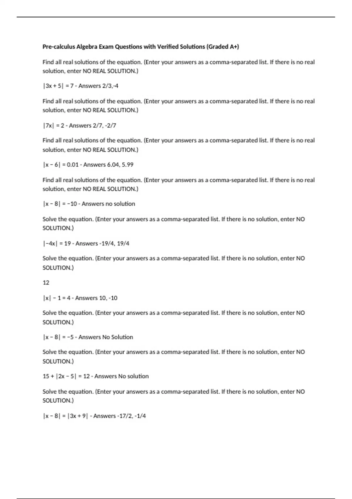 Pre-calculus Algebra Exam Questions with Verified Solutions (Graded A+) Find all real solutions of the equation. (Enter your answers as a comma-separated list. If there is no real solution, enter NO REAL SOLUTION.) |3x + 5| = 7 - Answers 2/3,-4 Find all real solutions of the equation. (Enter your answers as a comma-separated list. If there is no real solution, enter NO REAL SOLUTION.) |7x| = 2 - Answers 2/7, -2/7 Find all real solutions of the equation. (Enter your answers as a comma-separated list. If there is no real solution, enter NO REAL SOLUTION.) |x − 6| = 0.01 - Answers 6.04, 5.99 Find all real solutions of the equation. (Enter your answers as a comma-separated list. If there is no real solution, enter NO REAL SOLUTION.) |x − 8| = −10 - Answers no solution Solve the equation. (Enter your answers as a comma-separated list. If there is no solution, enter NO SOLUTION.) |−4x| = 19 - Answers -19/4, 19/4 Solve the equation. (Enter your answers as a comma-separated list. If there is no solution, enter NO SOLUTION.) 12 |x| − 1 = 4 - Answers 10, -10 Solve the equation. (Enter your answers as a comma-separated list. If there is no solution, enter NO SOLUTION.) |x − 8| = −5 - Answers No Solution Solve the equation. (Enter your answers as a comma-separated list. If there is no solution, enter NO SOLUTION.) 15 + |2x − 5| = 12 - Answers No solution Solve the equation. (Enter your answers as a comma-separated list. If there is no solution, enter NO SOLUTION.) |x − 8| = |3x + 9| - Answers -17/2, -1/4 Solve the equation. (Enter your answers as a comma-separated list. If there is no solution, enter NO SOLUTION.) |x + 3| = |2x + 2| - Answers 1, -5/3 Solve the inequality. Express the answer using interval notation. |3x| ≤ 18 - Answers [-6, 6] Solve the inequality. Express the answer using interval notation. 12 |x| ≥ 3 - Answers (-00, -3)U(9, 00) Solve the inequality. Express the answer using interval notation. |x + 1| ≤ 0 - Answers the point x = −1 Solve the inequality. Express the answer using interval notation. |3x − 2| > 10 - Answers (-00, -8/3)U(4, 00) Solve the inequality. Express the answer using interval notation. |5x − 8| < 10 - Answers (-2/5, 18/5) Solve the inequality. Express the answer using interval notation. 7|x + 3| + 8 > 2 - Answers (-00, 00) Yes or No? If No, give a reason. (a) Is the expression (x + 6)2 equal to x2 + 36? (b) When you expand (x + a)2,