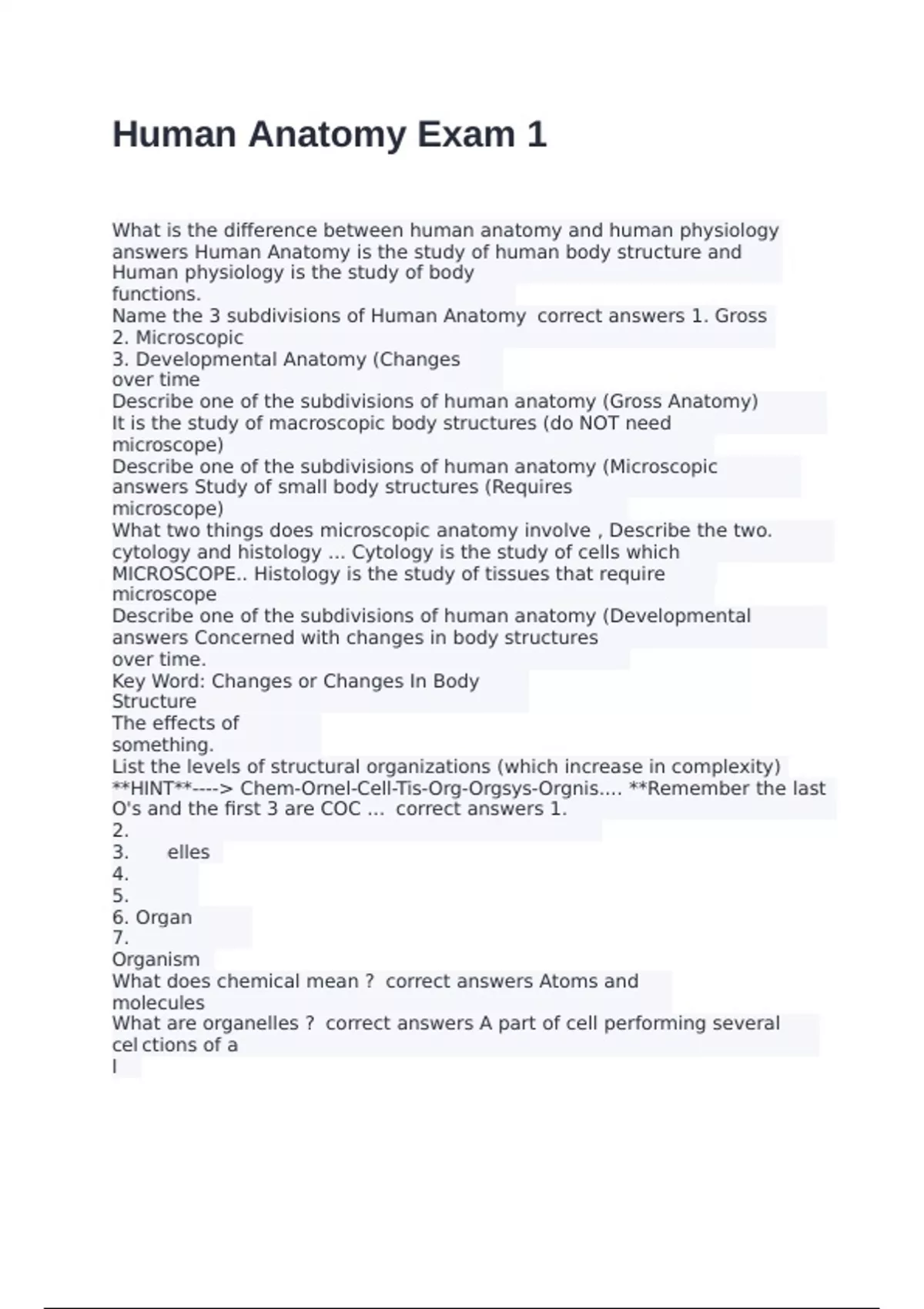 What is the difference between human anatomy and human physiology ? correct answers Human Anatomy is the study of human body structure and relationship... Human physiology is the study of body functions. Name the 3 subdivisions of Human Anatomy correct answers 1. Gross Anatomy 2. Microscopic Anatomy 3. Developmental Anatomy (Changes over time Describe one of the subdivisions of human anatomy (Gross Anatomy) correct answers It is the study of macroscopic body structures (do NOT need microscope) Describe one of the subdivisions of human anatomy (Microscopic Anatomy) correct answers Study of small body structures (Requires microscope) What two things does microscopic anatomy involve , Describe the two. correct answers cytology and histology ... Cytology is the study of cells which REQUIRE A MICROSCOPE.. Histology is the study of tissues that require microscope Describe one of the subdivisions of human anatomy (Developmental Anatomy) correct answers Concerned with changes in body structures over time. Key Word: Changes or Changes In Body Structure The effects of something. List the levels of structural organizations (which increase in complexity) in ORDER **HINT**---- Chem-Ornel-Cell-Tis-Org-Orgsys-Orgnis.... **Remember the last three are O's and the first 3 are COC ... correct answers 1. Chemical 2. Organelles 3. Cell 4. Tissues 5. Organs 6. Organ System 7. Organism What does chemical mean ? correct answers Atoms and molecules What are organelles ? correct answers A part of cell performing several functions of a cell