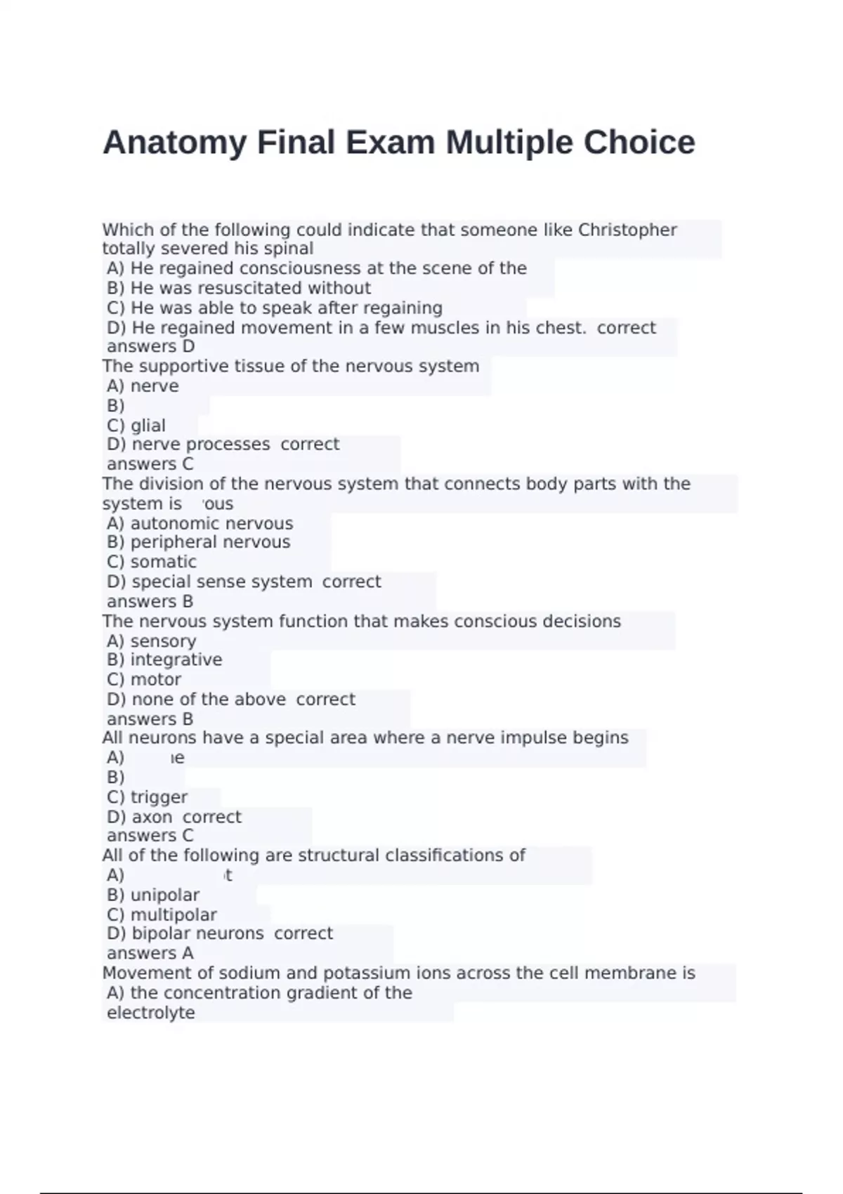Which of the following could indicate that someone like Christopher Reeve had not totally severed his spinal cord? A) He regained consciousness at the scene of the accident. B) He was resuscitated without difficulty. C) He was able to speak after regaining consciousness. D) He regained movement in a few muscles in his chest. correct answers D The supportive tissue of the nervous system is (are) A) nerve fiber B) myelin C) glial cells D) nerve processes correct answers C The division of the nervous system that connects body parts with the central nervous system is the A) autonomic nervous system B) peripheral nervous system C) somatic system D) special sense system correct answers B The nervous system function that makes conscious decisions possible is the A) sensory function B) integrative function C) motor function D) none of the above correct answers B All neurons have a special area where a nerve impulse begins called the A) soma B) ganglia C) trigger zone D) axon correct answers C All of the following are structural classifications of neurons except A) interneurons B) unipolar neurons C) multipolar neurons D) bipolar neurons correct answers A Movement of sodium and potassium ions across the cell membrane is dependent on A) the concentration gradient of the electrolyte B) changes in electrical charge