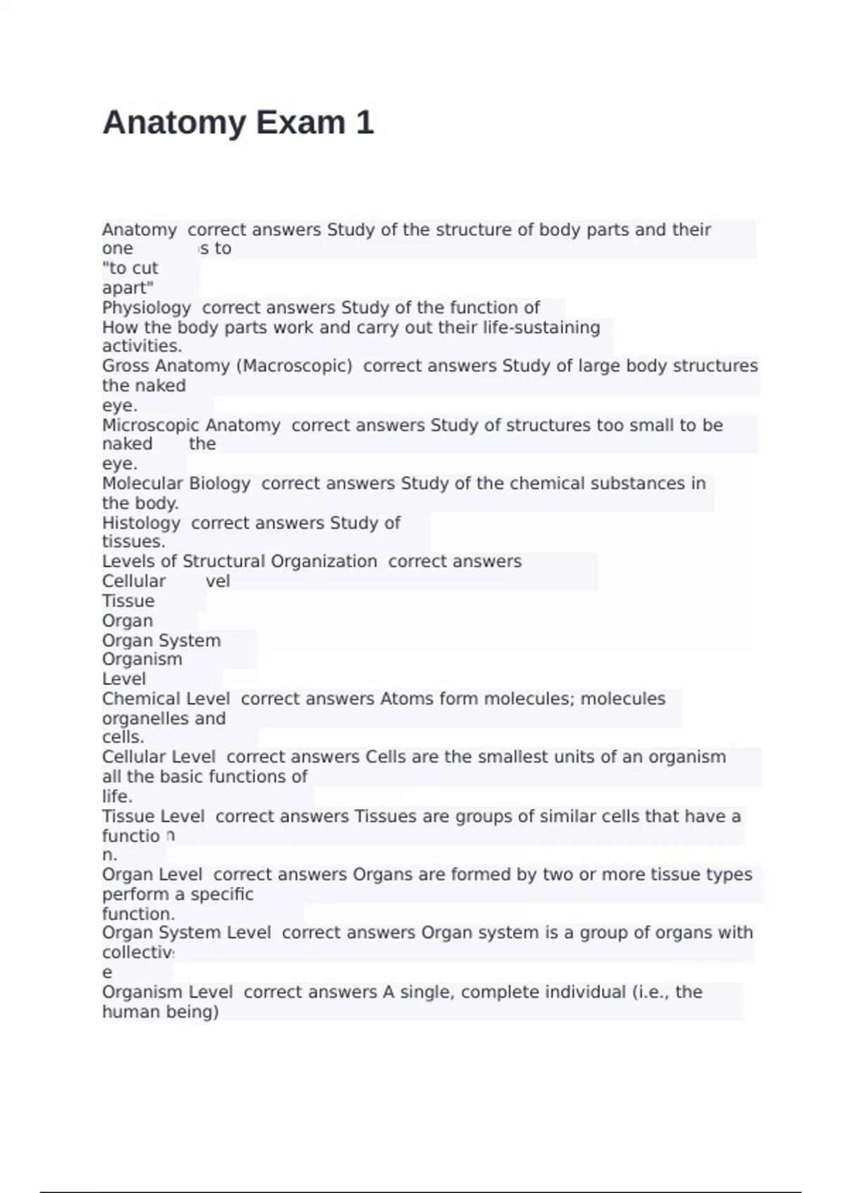 Anatomy correct answers Study of the structure of body parts and their relationships to one another. "to cut apart" Physiology correct answers Study of the function of the body. How the body parts work and carry out their life-sustaining activities. Gross Anatomy (Macroscopic) correct answers Study of large body structures visible to the naked eye. Microscopic Anatomy correct answers Study of structures too small to be seen with the naked eye. Molecular Biology correct answers Study of the chemical substances in the body. Histology correct answers Study of tissues. Levels of Structural Organization correct answers Chemical Level Cellular Level Tissue Level Organ Level Organ System Level Organism Level Chemical Level correct answers Atoms form molecules; molecules assemble organelles and cells. Cellular Level correct answers Cells are the smallest units of an organism that carry out all the basic functions of life. Tissue Level correct answers Tissues are groups of similar cells that have a common function. Organ Level correct answers Organs are formed by two or more tissue types in order to perform a specific function. Organ System Level correct answers Organ system is a group of organs with a unique collective Organism Level correct answers A single, complete individual (i.e., the human being)