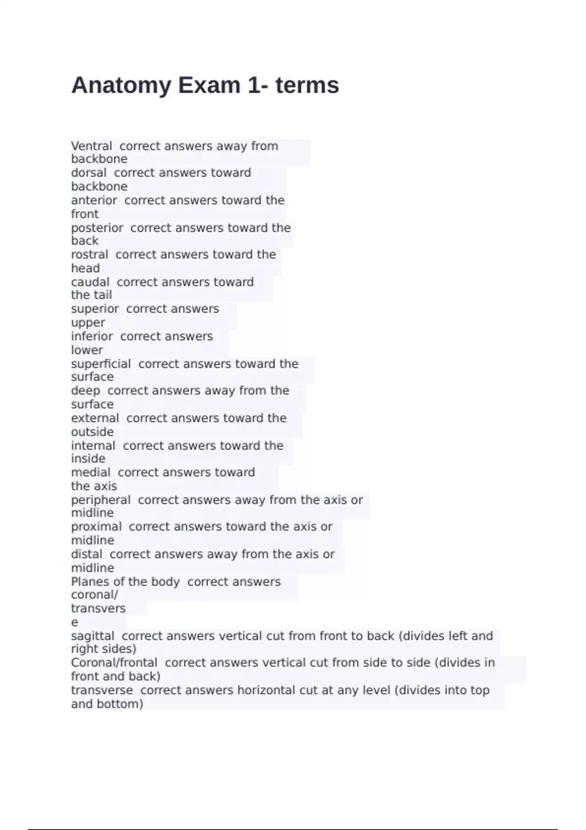 Ventral correct answers away from backbone dorsal correct answers toward backbone anterior correct answers toward the front posterior correct answers toward the back rostral correct answers toward the head caudal correct answers toward the tail superior correct answers upper inferior correct answers lower superficial correct answers toward the surface deep correct answers away from the surface external correct answers toward the outside internal correct answers toward the inside medial correct answers toward the axis peripheral correct answers away from the axis or midline proximal correct answers toward the axis or midline distal correct answers away from the axis or midline Planes of the body correct answers sagittal coronal/frontal transverse sagittal correct answers vertical cut from front to back (divides left and right sides) Coronal/frontal correct answers vertical cut from side to side (divides in front and back) transverse correct answers