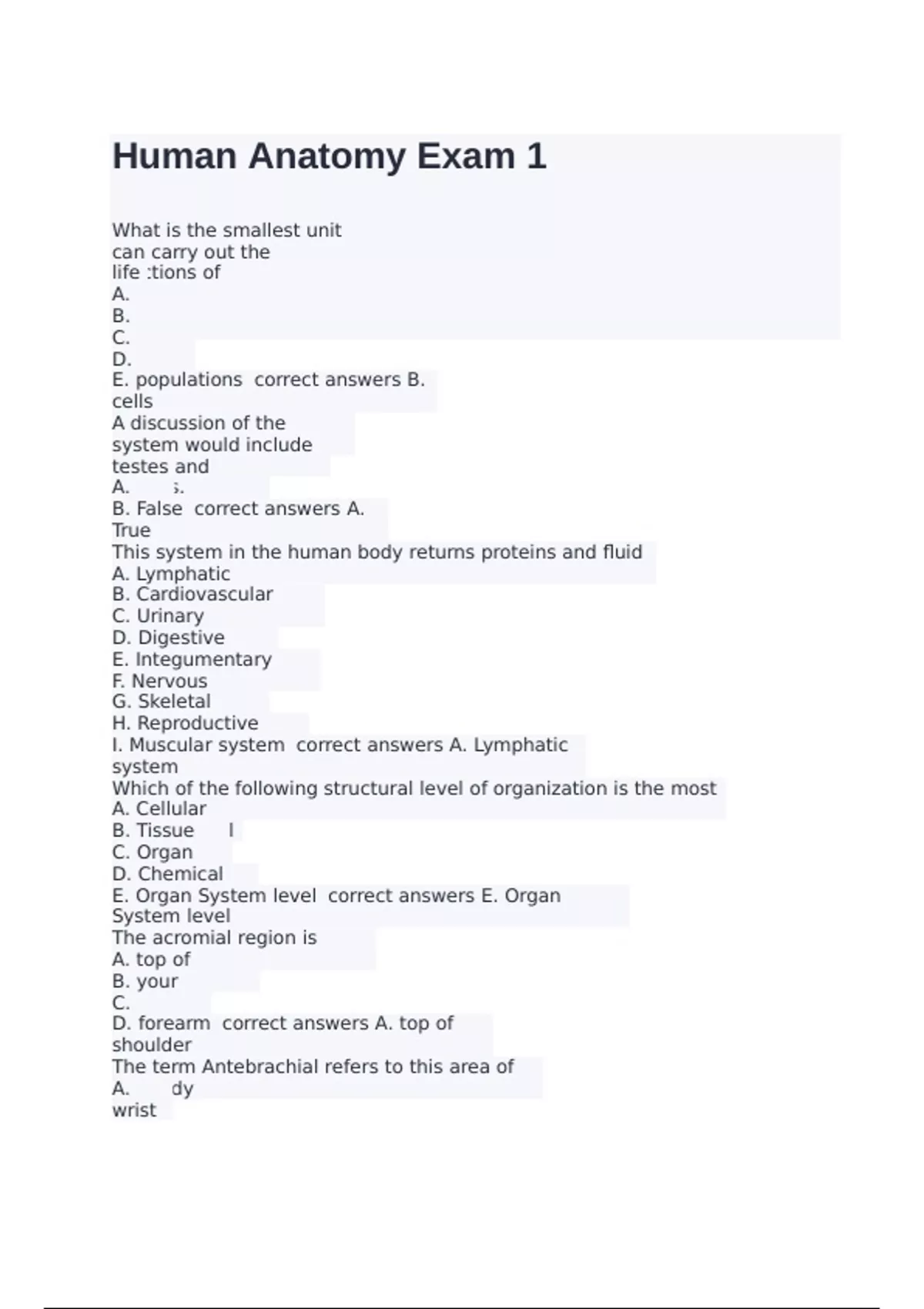 What is the smallest unit that can carry out the functions of life? A. atoms B. cells C. tissues D. organs E. populations correct answers B. cells A discussion of the endocrine system would include both testes and ovaries. A. True B. False correct answers A. True This system in the human body returns proteins and fluid to blood. A. Lymphatic system B. Cardiovascular system C. Urinary system D. Digestive system E. Integumentary system F. Nervous system G. Skeletal system H. Reproductive system I. Muscular system correct answers A. Lymphatic system Which of the following structural level of organization is the most complex? A. Cellular level B. Tissue level C. Organ level D. Chemical level E. Organ System level correct answers E. Organ System level The acromial region is located .. A. top of shoulder B. your side C. elbow D. forearm correct answers A. top of shoulder The term Antebrachial refers to this area of the body A. wrist B. neck
