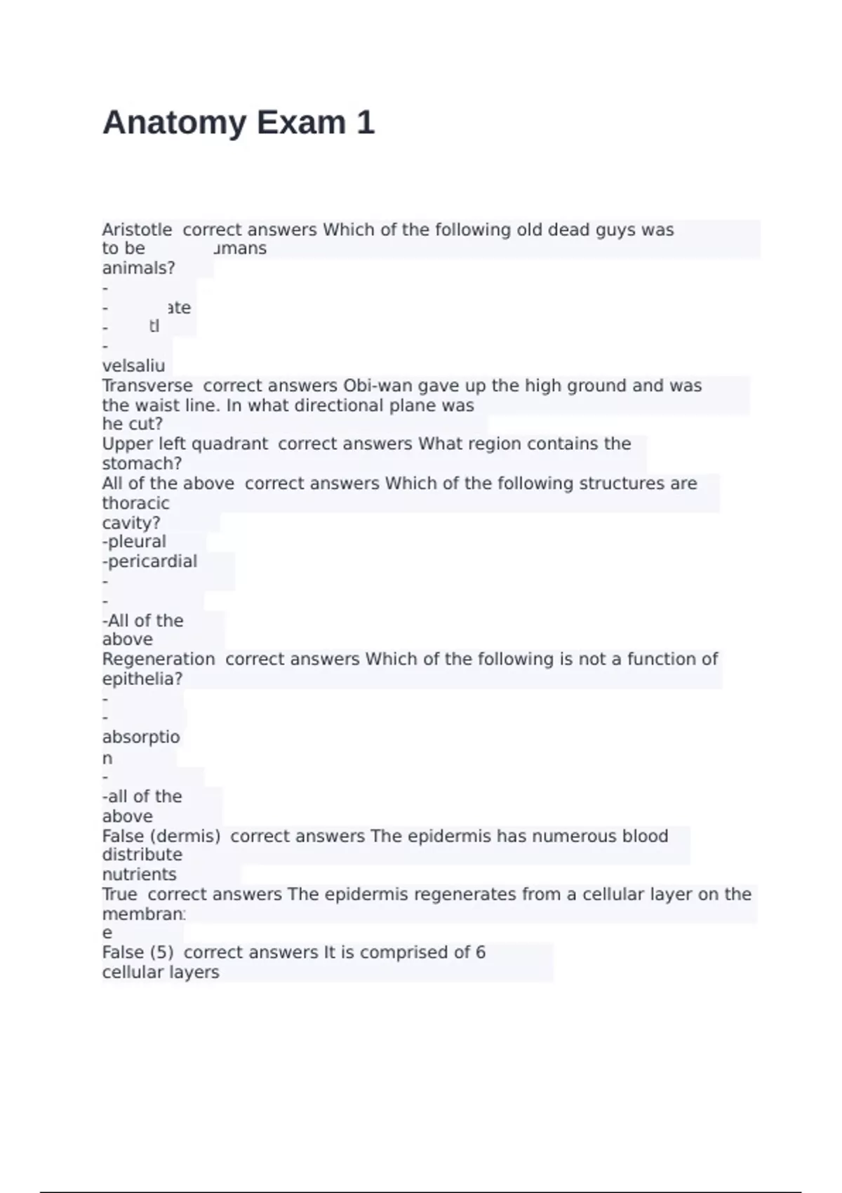 Aristotle correct answers Which of the following old dead guys was considered humans to be animals? -hippocrates -aristotle -galen -velsalius Transverse correct answers Obi-wan gave up the high ground and was sliced through the waist line. In what directional plane was he cut? Upper left quadrant correct answers What region contains the stomach? All of the above correct answers Which of the following structures are found in the thoracic cavity? -pleural cavity -pericardial cavity -trachea -mediastinum -All of the above Regeneration correct answers Which of the following is not a function of epithelia? -protection -absorption -secretion -excretion -regeneration -all of the above False (dermis) correct answers The epidermis has numerous blood vessels to distribute nutrients True correct answers The epidermis regenerates from a cellular layer on the basement membrane False (5) correct answers It is comprised of 6 cellular layers