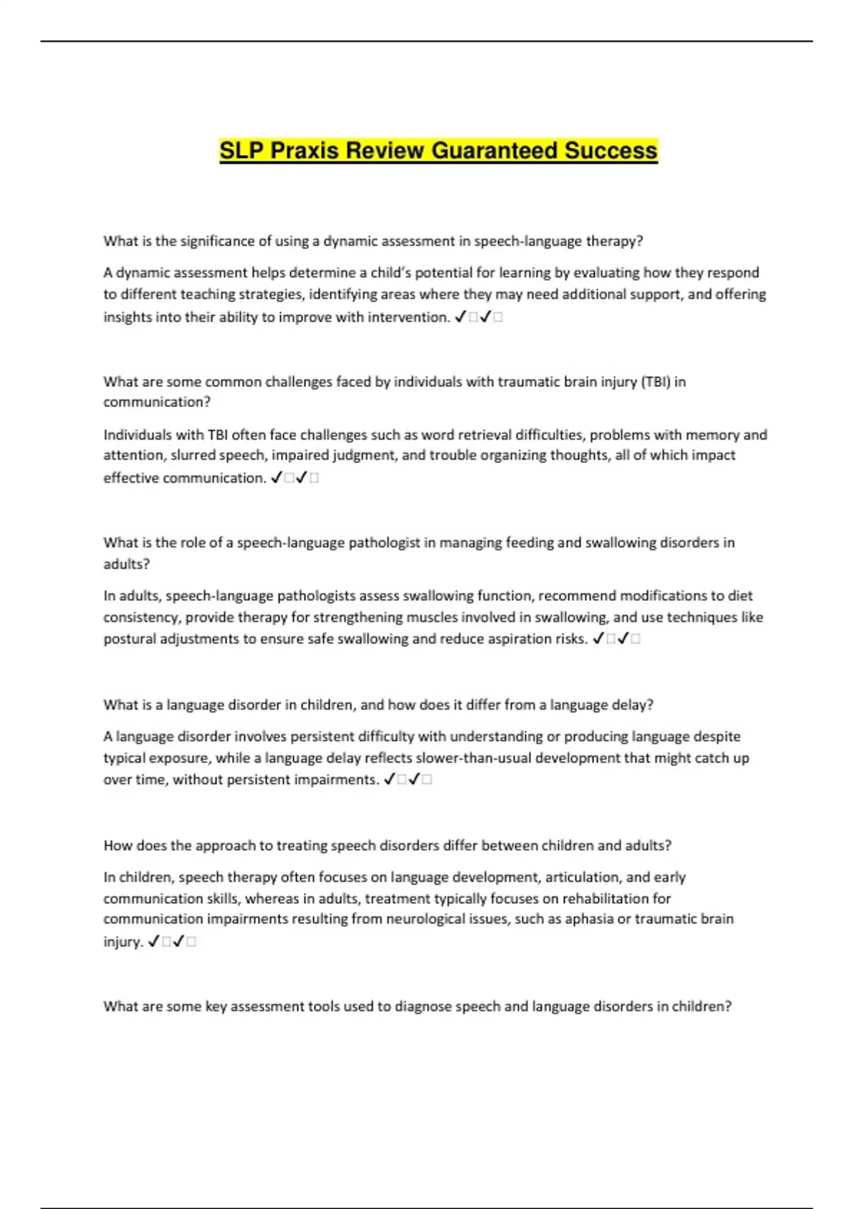 SLP Praxis Review Guaranteed Success What is the significance of using a dynamic assessment in speech-language therapy? A dynamic assessment helps determine a child’s potential for learning by evaluating how they respond to different teaching strategies, identifying areas where they may need additional support, and offering insights into their ability to improve with intervention. ️️ What are some common challenges faced by individuals with traumatic brain injury (TBI) in communication? Individuals with TBI often face challenges such as word retrieval difficulties, problems with memory and attention, slurred speech, impaired judgment, and trouble organizing thoughts, all of which impact effective communication. ️️ What is the role of a speech-language pathologist in managing feeding and swallowing disorders in adults? In adults, speech-language pathologists assess swallowing function, recommend modifications to diet consistency, provide therapy for strengthening muscles involved in swallowing, and use techniques like postural adjustments to ensure safe swallowing and reduce aspiration risks. ️️ What is a language disorder in children, and how does it differ from a language delay? A language disorder involves persistent difficulty with understanding or producing language despite typical exposure, while a language delay reflects slower-than-usual development that might catch up over time, without persistent impairments. ️️ How does the approach to treating speech disorders differ between children and adults? In children, speech therapy often focuses on language development, articulation, and early communication skills, whereas in adults, treatment typically focuses on rehabilitation for communication impairments resulting from neurological issues, such as aphasia or traumatic brain injury. ️️ What are some key assessment tools used to diagnose speech and language disorders in children? Key assessment tools for diagnosing speech and language disorders in children include standardized tests, observational assessments, parent and teacher questionnaires, language samples, and hearing tests. ️️ What is the primary goal of speech therapy for children with Down syndrome? The primary goal of speech therapy for children with Down syndrome is to improve language development, focusing on speech clarity, vocabulary expansion, social communication, and functional communication skills, tailored to their unique needs. ️️ What is the difference between apraxia of speech and dysarthria? Apraxia of speech is a motor speech disorder caused by difficulty planning and coordinating the movements necessary for speech, while dysarthria is caused by muscle weakness, leading to slurred or imprecise speech. ️️ What is a common feature of language disorders in children with intellectual disabilities? Children with intellectual disabilities may have delayed language development, with difficulties in expressive and receptive language, reduced vocabulary, and challenges in constructing grammatically correct sentences. ️️ What are some ways a speech-language pathologist can help individuals with autism spectrum disorder (ASD) improve communication? A speech-language pathologist can help individuals with ASD by using visual supports, promoting social skills through structured play, teaching alternative communication methods like sign language or AAC devices, and focusing on pragmatic language skills. ️️ How does speech therapy benefit individuals with Parkinson's disease? Speech therapy benefits individuals with Parkinson's disease by helping to improve speech clarity, vocal strength, and breath support, as well as teaching strategies to reduce the risk of choking and improve swallowing. ️️ What is the importance of providing language interventions in both home and school settings for children with speech-language disorders? Providing interventions in both home and school settings ensures consistency in pra