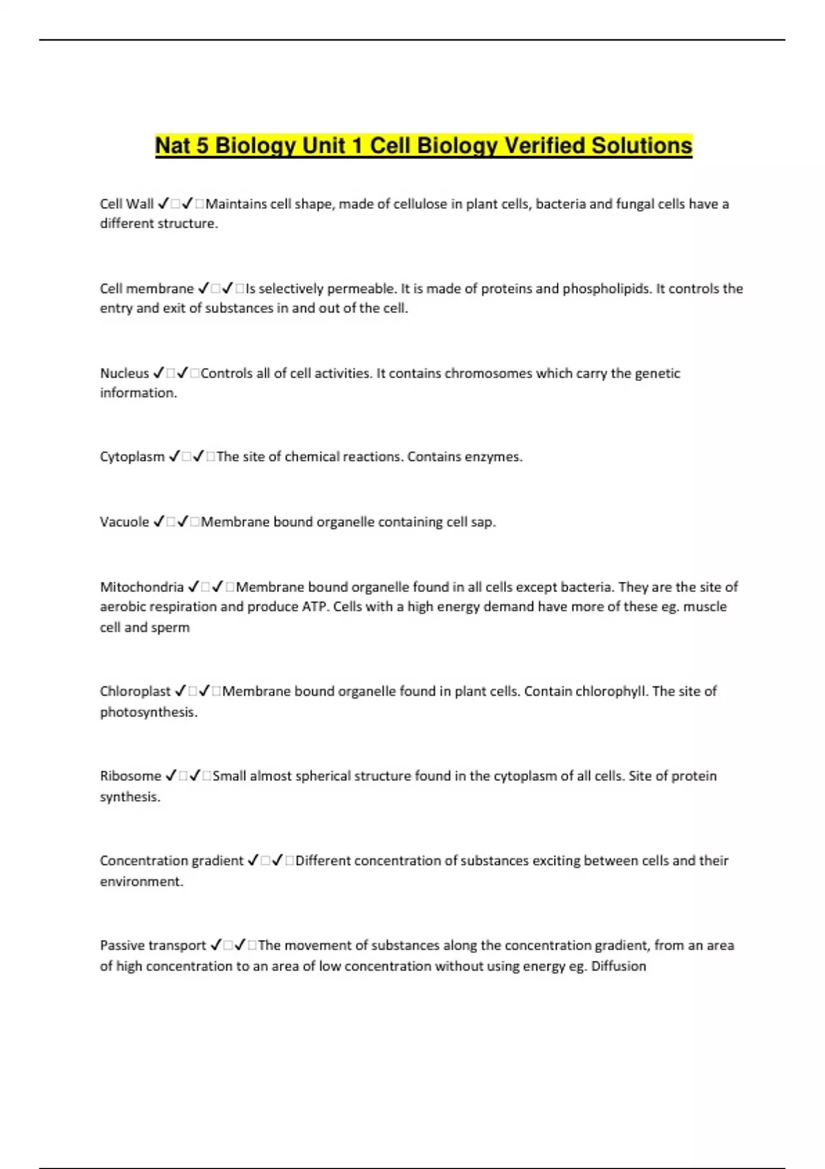 Nat 5 Biology Unit 1 Cell Biology Verified Solutions Cell Wall ️️Maintains cell shape, made of cellulose in plant cells, bacteria and fungal cells have a different structure. Cell membrane ️️Is selectively permeable. It is made of proteins and phospholipids. It controls the entry and exit of substances in and out of the cell. Nucleus ️️Controls all of cell activities. It contains chromosomes which carry the genetic information. Cytoplasm ️️The site of chemical reactions. Contains enzymes. Vacuole ️️Membrane bound organelle containing cell sap. Mitochondria ️️Membrane bound organelle found in all cells except bacteria. They are the site of aerobic respiration and produce ATP. Cells with a high energy demand have more of these eg. muscle cell and sperm Chloroplast ️️Membrane bound organelle found in plant cells. Contain chlorophyll. The site of photosynthesis. Ribosome ️️Small almost spherical structure found in the cytoplasm of all cells. Site of protein synthesis. Concentration gradient ️️Different concentration of substances exciting between cells and their environment. Passive transport ️️The movement of substances along the concentration gradient, from an area of high concentration to an area of low concentration without using energy eg. Diffusion Osmosis ️️The movement of water molecules from an area of high concentration to an area of low concentration across a selectively permeable membrane. Active transport ️️The movement of substances from an area of low concentration to an an of high concentration. Requires energy. Cell division ️️Essential for growth and repair. The parent cell divides to produce two genetically identical cells. If becomes uncontrolled it can cause cancer. Mitosis ️️The division of the nucleus. Chromosomes ️️Thread-like structures found in the nucleus. Contain genetic information which controls cell activities. Made of DNA DNA ️️Made of two backbones to which bases are attached. The bases are A, C, T, G. The bases fit together in a particular way; A to T and C to G. This is called complementary base pairing. These strands twist and form a double-stranded helix. mRNA ️️Made in the nucleus by copying the genetic code for a gene and carries this copy to a ribosome. Protein ️️Made from amino acids. Joined together by polypeptide chains. Have a complex shape. The shape determines it's function. Enzymes ️️Biological catalysts which speed up vital chemical reactions. Hormones ️️Chemical messengers which help control the body's systems eg. Insulin Structural proteins ️️The building blocks which form cells, organs and tissues eg. Keratin. Antibodies ️️Produced by white blood cells to defend the body against viruses and unwanted bacteria. Receptors ️️Found in membranes of cells. Receive signals from molecules outside the cell and pass them across the membrane into the cell. Degradation reaction ️️Large substrate broken down into smaller product. Synthesis reaction ️️Small substrate built up to make a larger product. Genetic engineering ️️A technology that allows scientists to transfer DNA from one organism to another. Photosynthesis ️️A series of enzyme controlled reactions using the raw products, carbon dioxide and water to form glucose and oxygen. Green plants use this process to make their own food. Respiration ️️Chemical energy released by all cells through a series of enzyme controlled reactions. Glucose and oxygen to form carbon dioxide, water and ATP