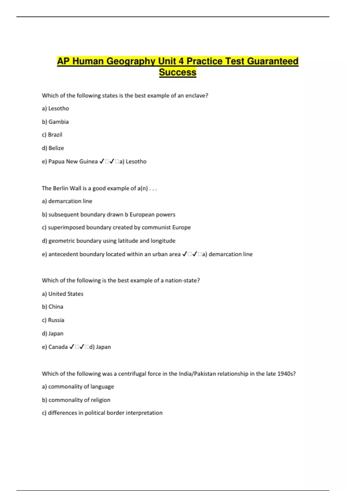 AP Human Geography Unit 4 Practice Test Guaranteed Success Which of the following states is the best example of an enclave? a) Lesotho b) Gambia c) Brazil d) Belize e) Papua New Guinea ️️a) Lesotho The Berlin Wall is a good example of a(n) . . . a) demarcation line b) subsequent boundary drawn b European powers c) superimposed boundary created by communist Europe d) geometric boundary using latitude and longitude e) antecedent boundary located within an urban area ️️a) demarcation line Which of the following is the best example of a nation-state? a) United States b) China c) Russia d) Japan e) Canada ️️d) Japan Which of the following was a centrifugal force in the India/Pakistan relationship in the late 1940s? a) commonality of language b) commonality of religion c) differences in political border interpretation d) differences in religion e) commonality of climate ️️d) differences in religion Which of the following is the best example of a perforated state? a) France b) Vietnam c) Singapore d) Ecuador e) Italy ️️e) Italy Which international organization could best be incorporated into Spykman's rimland theory? a) United Nations b) European Union c) NATO (North Atlantic Treaty Organization) d) NAFTA (North American Free Trade Agreement) e) Warsaw Pact ️️c) NATO (North Atlantic Treaty Organization) The largest territory in the world in terms of population is. . . a) the Solomon Islands b) Puerto Rico c) the Falkland Islands d) India e) )Taiwan ️️b) Puerto Rico Which of the following is the best example of a city-state?