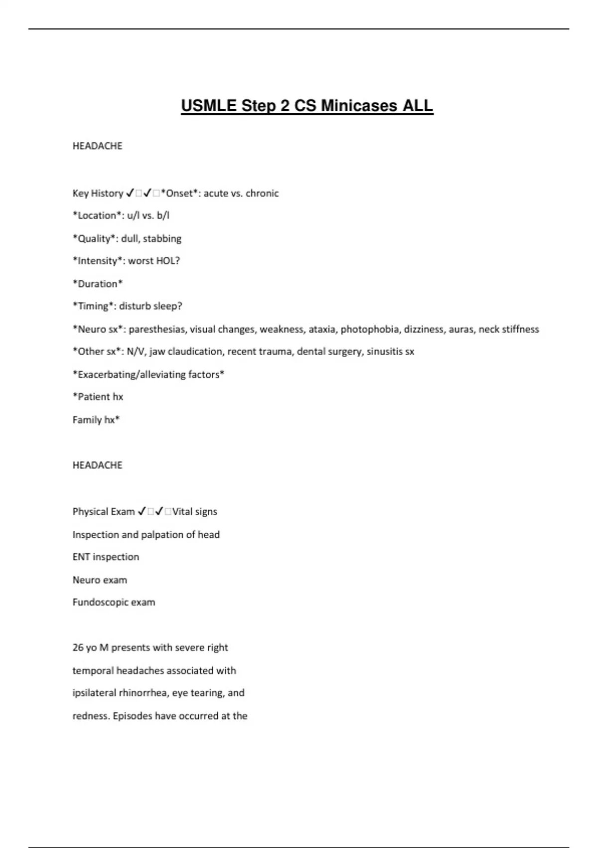 USMLE Step 2 CS Minicases ALL HEADACHE Key History ️️*Onset*: acute vs. chronic *Location*: u/l vs. b/l *Quality*: dull, stabbing *Intensity*: worst HOL? *Duration* *Timing*: disturb sleep? *Neuro sx*: paresthesias, visual changes, weakness, ataxia, photophobia, dizziness, auras, neck stiffness *Other sx*: N/V, jaw claudication, recent trauma, dental surgery, sinusitis sx *Exacerbating/alleviating factors* *Patient hx Family hx* HEADACHE Physical Exam ️️Vital signs Inspection and palpation of head ENT inspection Neuro exam Fundoscopic exam 26 yo M presents with severe right temporal headaches associated with ipsilateral rhinorrhea, eye tearing, and redness. Episodes have occurred at the same time every night for the past week and last for 45 minutes. ️️*Cluster headache* Migraine Tension headache Sinusitis Pseudotumor cerebri Trigeminal neuralgia Intracranial neoplasm CBC ESR CT—head MRI—brain LP 21 yo F presents with several episodes of throbbing left temporal pain that lasts for 2-3 hours. Prior to its onset, she sees fl ashes of light in her right visual fi eld and feels weakness and numbness on the right side of her body for a few minutes. Headaches are often associated with nausea and vomiting. She has a family history of migraine. ️️*Migraine (complicated)* Tension headache Cluster headache Pseudotumor cerebri Trigeminal neuralgia CNS vasculitis Partial seizure Intracranial neoplasm CBC ESR CT—head MRI—brain LP 65 yo F presents with severe, intermittent right temporal headache, fever, blurred vision in her right eye, and pain in her jaw when chewing. ️️*Temporal arteritis (giant cell arteritis)* Migraine Cluster headache Tension headache Meningitis Carotid artery dissection Pseudotumor cerebri Trigeminal neuralgia Intracranial neoplasm CBC ESR CRP Temporal artery biopsy Doppler U/S—carotid