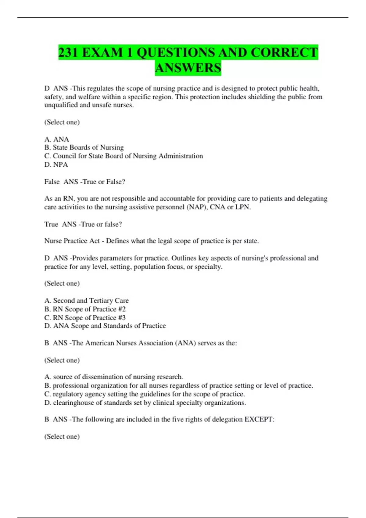 231 EXAM 1 QUESTIONS AND CORRECT