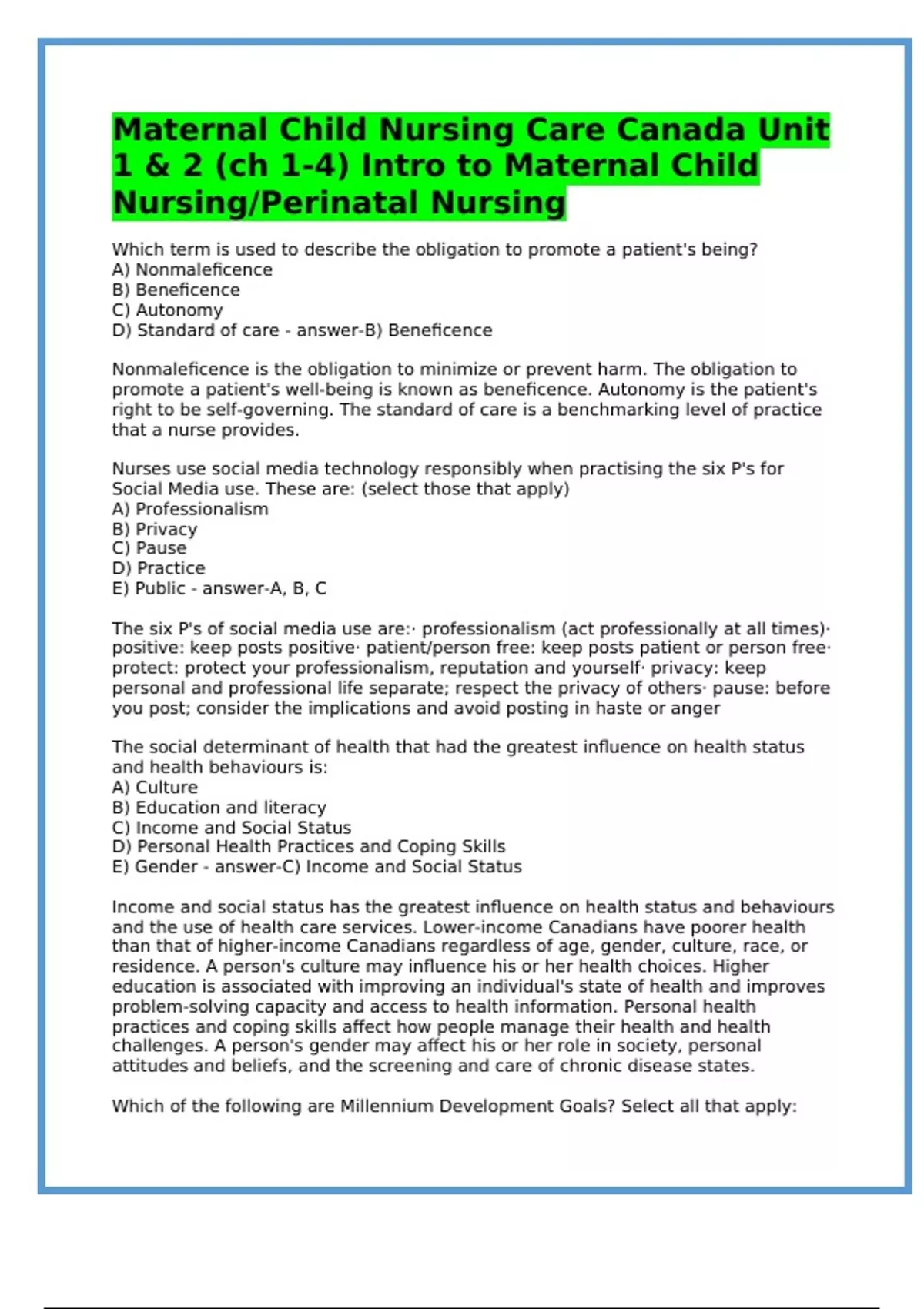 Which term is used to describe the obligation to promote a patient's being? A) Nonmaleficence B) Beneficence C) Autonomy D) Standard of care - answer-B) Beneficence Nonmaleficence is the obligation to minimize or prevent harm. The obligation to promote a patient's well-being is known as beneficence. Autonomy is the patient's right to be self-governing. The standard of care is a benchmarking level of practice that a nurse provides. Nurses use social media technology responsibly when practising the six P's for Social Media use. These are: (select those that apply) A) Professionalism B) Privacy C) Pause D) Practice E) Public - answer-A, B, C The six P's of social media use are:· professionalism (act professionally at all times)· positive: keep posts positive· patient/person free: keep posts patient or person free· protect: protect your professionalism, reputation and yourself· privacy: keep personal and professional life separate; respect the privacy of others· pause: before you post; consider the implications and avoid posting in haste or anger The social determinant of health that had the greatest influence on health status and health behaviours is: A) Culture B) Education and literacy C) Income and Social Status D) Personal Health Practices and Coping Skills E) Gender - answer-C) Income and Social Status Income and social status has the greatest influence on health status and behaviours and the use of health care services. Lower-income Canadians have poorer health than that of higher-income Canadians regardless of age, gender, culture, race, or residence. A person's culture may influence his or her health choices. Higher education is associated with improving an individual's state of health and improves problem-solving capacity and access to health information. Personal health practices and coping skills affect how people manage their health and health challenges. A person's gender may affect his or her role in society, personal attitudes and beliefs, and the screening and care of chronic disease states. Which of the following are Millennium Development Goals? Select all that apply: A) Environmental Sustainability B) Gender Equality C) Infant Health Improvements D) Universal Secondary Education E) Eliminate extreme hunger and poverty - answer-A, B, D Ensuring environmental sustainability, promoting gender equality and empowering women, and eradicating extreme poverty and hunger are all Millennium Development Goals (MDGs) as defined by the United Nations. The MDGs also include improving maternal health and achieving universal primary education; reducing child mortality; combatting HIV/AIDs, malaria, and other diseases; and developing a global partnership for development. The Nurse is aware that avoiding the use of abbreviation acronyms, and symbols can reduce the risk of medication administration errors. The institure of Safe Medication Practices (ISMP) lists those to avoid as: Select all that apply A) OD B) D/C C) BID D) PO E) IU - answer-A, B, D OD can be mistaken as right eye (OD = oculus dexter); use the word daily. D/C can be interpreted as "discontinue use of medication"; use the word discharge; IU can be mistaken for "IV" (intravenous) or the number 10 (ten); use the words international unit. BID and PO are not included on the ISMP "Do Not Use" list. A mother's household consists of her husband, his mother, and another child. She is living in a/an: A) extended family B) lone-parent family C) married-blended family D) common-law family. - answer-A) Extended Family An extended family includes blood relatives living with the nuclear family. Both parents and grandparents are living in this extended family. An unmarried biological or adoptive parent who may or may not be living with other adults constitutes a lone-parent family. Married-blended refers to unrelated families joined after divorce. An unmarried couple makes up a common-law family. What is descriptive of the family systems theory? A) The family is viewed as the sum of individual members. B) When the family system is disrupted, change can occur at any point in the system. C) Change in one family member cannot create change in other members. D) Individual family members are readily identified as the source of a problem. - answer-B. When the family system is disrupted, change can occur at any point in the system. Although the family is the sum of the individual members, the family systems theory is a theory of human behaviour and focuses on the reciprocal effect of interactions that can occur. The family systems theory describes an interactional model. A change in one member will affect other family members. The interactions are considered to be the problem, not the individual family members. The term used to describe a group that sustains its own characteristics while existing within a larger cultural system is called: A) subculture. B) cultural relativism. C) acculturation. D) ethnocentrism. - answer-A) subculture. A subculture is an ethnic or other organized group that retains its traditions and health and social practices while existing within a larger cultural system. Cultural relativism refers to learning about and applying the standards of another person's culture to activities within that culture. Acculturation refers to changes that occur within one group or among several groups when people from different cultures come in contact with one another. Ethnocentrism is a belief in the rightness of one's culture's way of doing things.