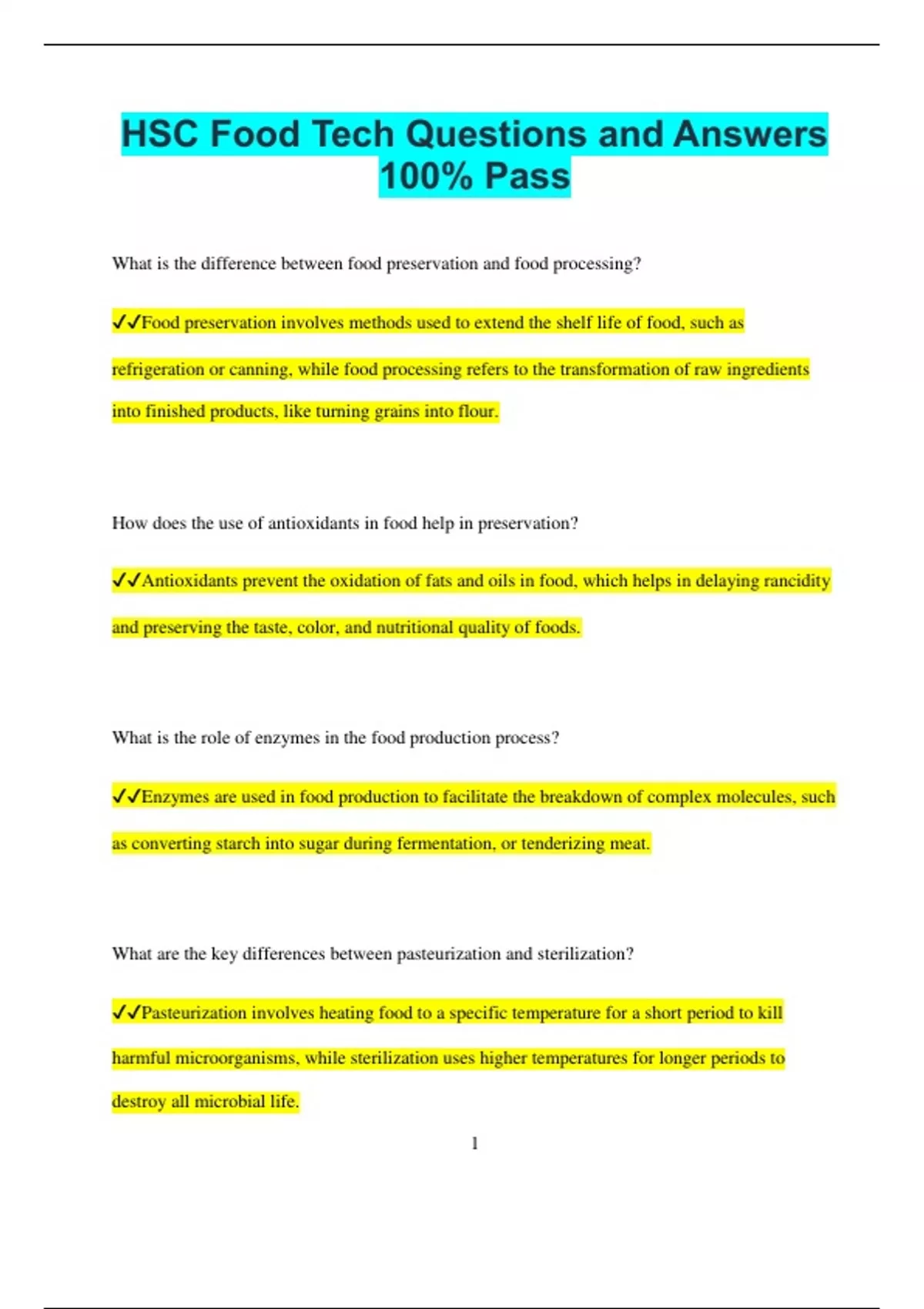 HSC Food Tech Questions and Answers 100% Pass