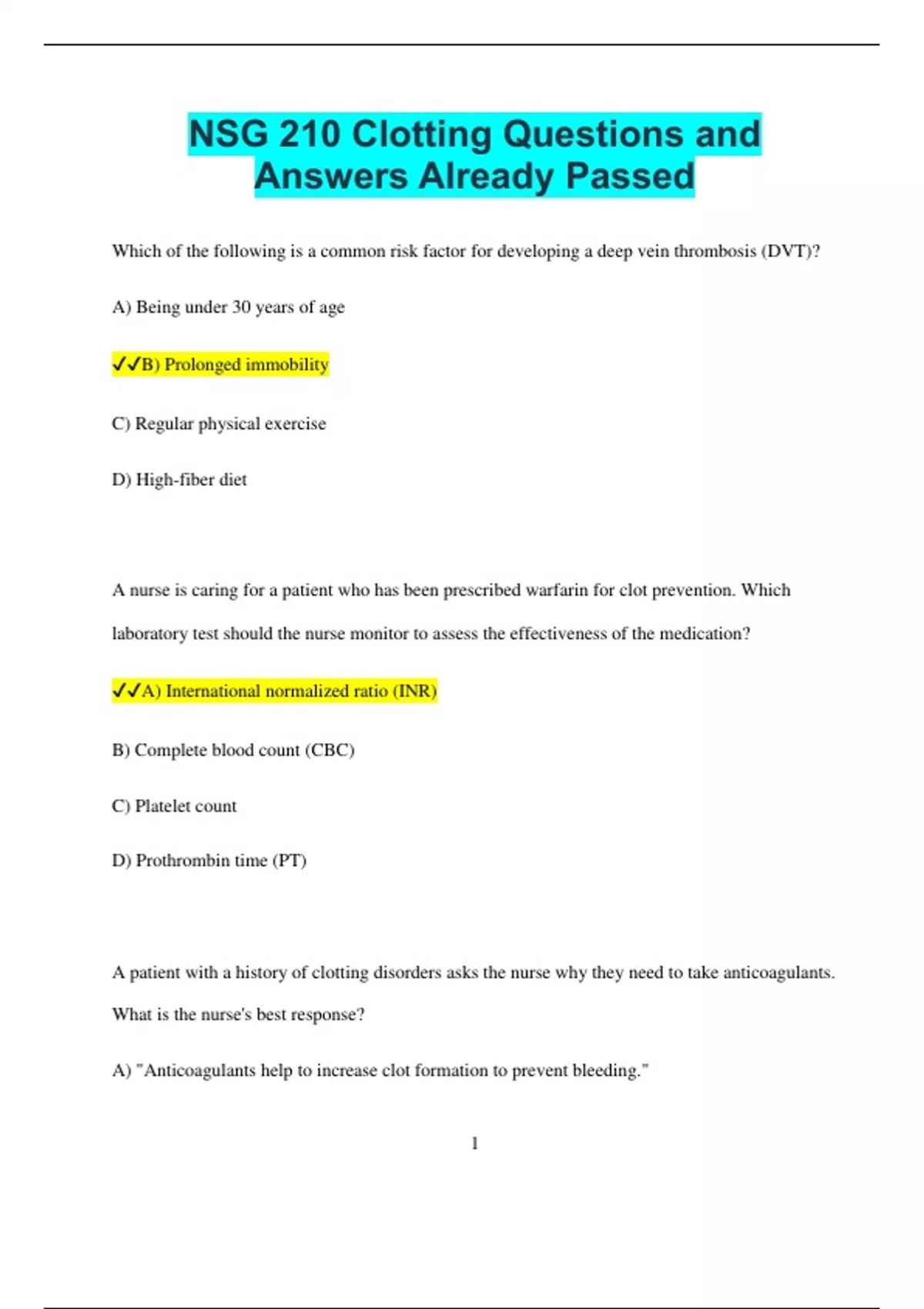 NSG 210 Clotting Questions and