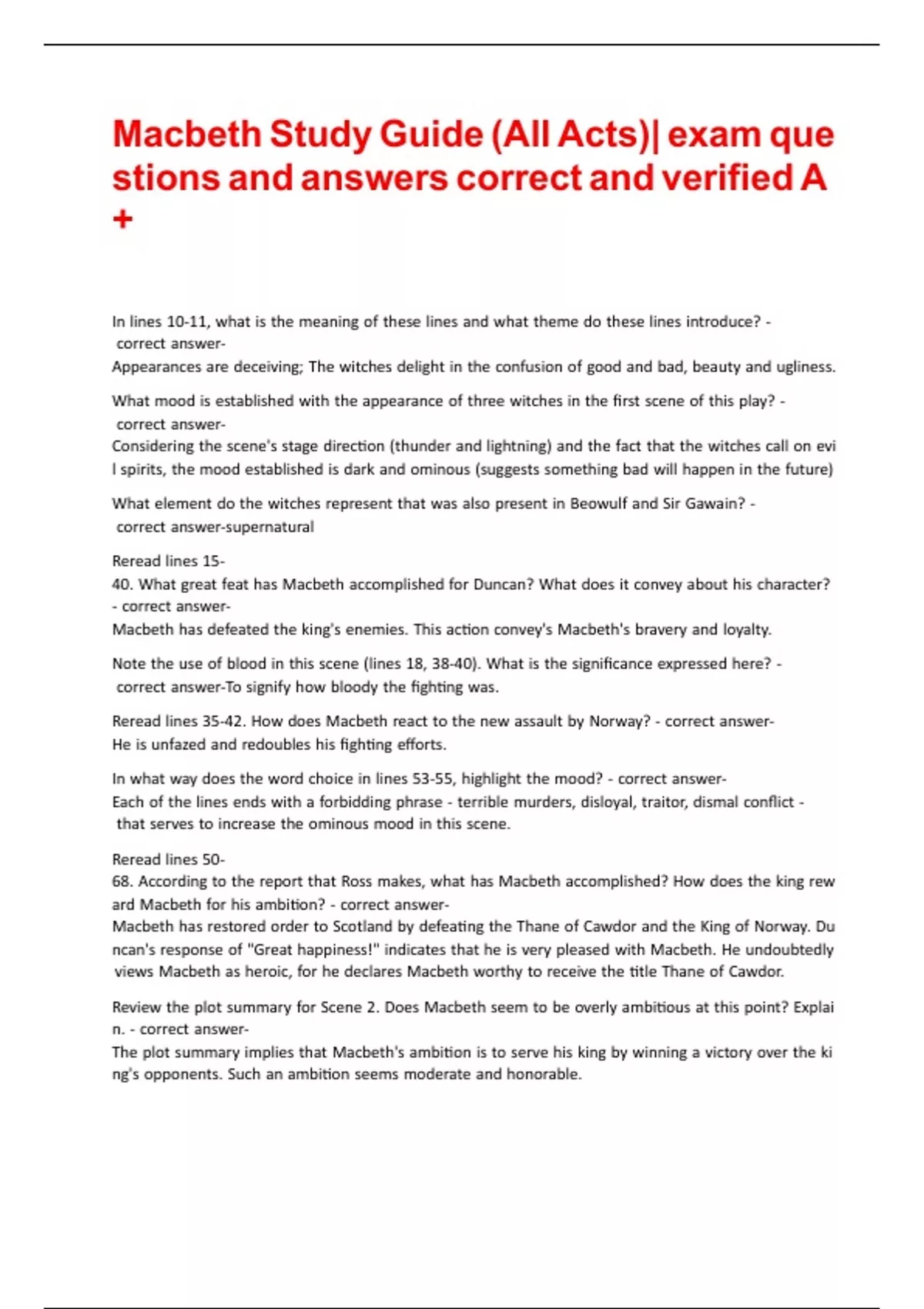 Macbeth Study Guide (All Acts)| exam questions and answers correct and verified A+