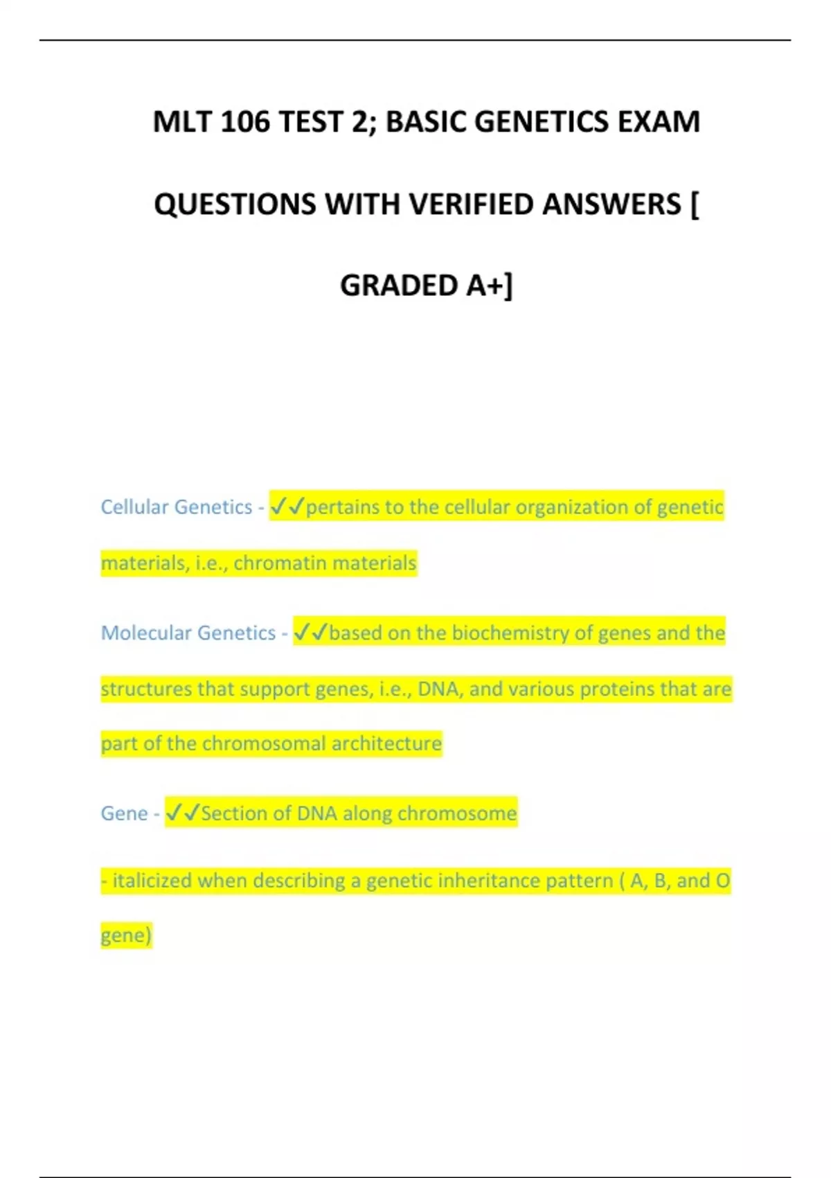 MLT 106 TEST 2; BASIC GENETICS EXAM QUESTIONS WITH VERIFIED ANSWERS [ GRADED A+] Cellular Genetics - pertains to the cellular organization of genetic materials, i.e., chromatin materials Molecular Genetics - based on the biochemistry of genes and the structures that support genes, i.e., DNA, and various proteins that are part of the chromosomal architecture Gene - Section of DNA along chromosome - italicized when describing a genetic inheritance pattern ( A, B, and O gene)