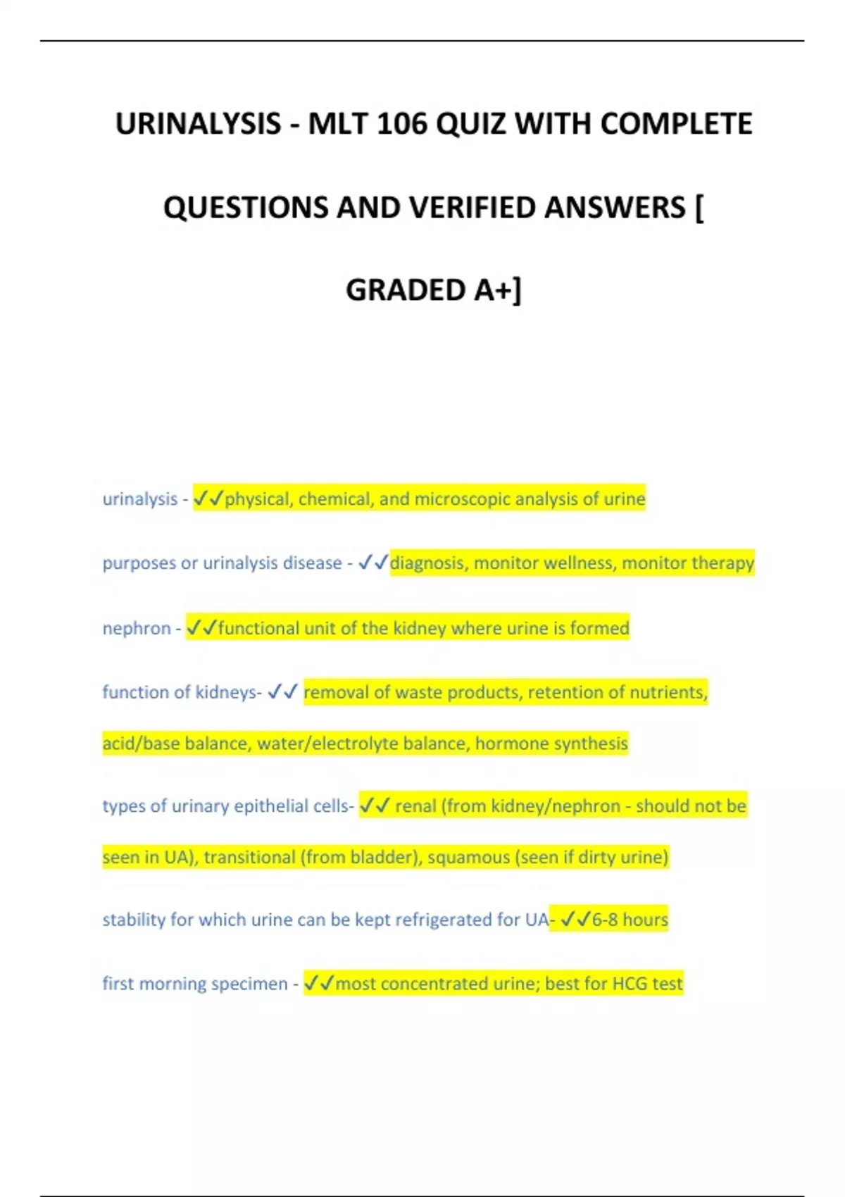 URINALYSIS - MLT 106 QUIZ WITH COMPLETE QUESTIONS AND VERIFIED ANSWERS [ GRADED A+] urinalysis - physical, chemical, and microscopic analysis of urine purposes or urinalysis disease - diagnosis, monitor wellness, monitor therapy nephron - functional unit of the kidney where urine is formed function of kidneys- removal of waste products, retention of nutrients, acid/base balance, water/electrolyte balance, hormone synthesis types of urinary epithelial cells- renal (from kidney/nephron - should not be seen in UA), transitional (from bladder), squamous (seen if dirty urine) stability for which urine can be kept refrigerated for UA- 6-8 hours first morning specimen - most concentrated urine; best for HCG test